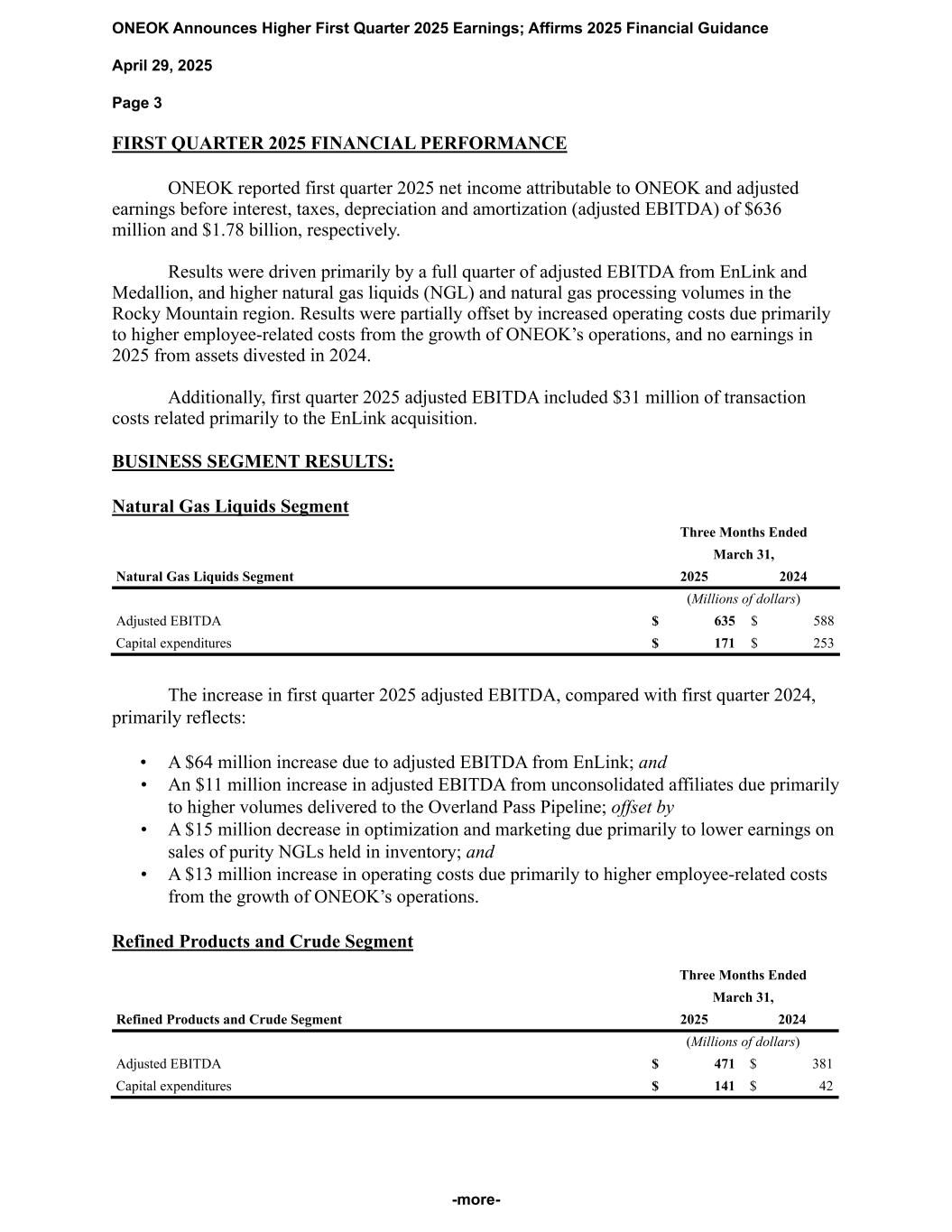 ONEOK Announces Higher First Quarter 2025 Earnings; Affirms 2025 Financial Guidance April 29, 2025 Page 3 -more- FIRST QUARTER 2025 FINANCIAL PERFORMANCE ONEOK reported first quarter 2025 net income attributable to ONEOK and adjusted earnings before interest, taxes, depreciation and amortization (adjusted EBITDA) of $636 million and $1.78 billion, respectively. Results were driven primarily by a full quarter of adjusted EBITDA from EnLink and Medallion, and higher natural gas liquids (NGL) and natural gas processing volumes in the Rocky Mountain region. Results were partially offset by increased operating costs due primarily to higher employee-related costs from the growth of ONEOK’s operations, and no earnings in 2025 from assets divested in 2024. Additionally, first quarter 2025 adjusted EBITDA included $31 million of transaction costs related primarily to the EnLink acquisition. BUSINESS SEGMENT RESULTS: Natural Gas Liquids Segment Three Months Ended March 31, Natural Gas Liquids Segment 2025 2024 (Millions of dollars) Adjusted EBITDA $ 635 $ 588 Capital expenditures $ 171 $ 253 The increase in first quarter 2025 adjusted EBITDA, compared with first quarter 2024, primarily reflects: • A $64 million increase due to adjusted EBITDA from EnLink; and • An $11 million increase in adjusted EBITDA from unconsolidated affiliates due primarily to higher volumes delivered to the Overland Pass Pipeline; offset by • A $15 million decrease in optimization and marketing due primarily to lower earnings on sales of purity NGLs held in inventory; and • A $13 million increase in operating costs due primarily to higher employee-related costs from the growth of ONEOK’s operations. Refined Products and Crude Segment Three Months Ended March 31, Refined Products and Crude Segment 2025 2024 (Millions of dollars) Adjusted EBITDA $ 471 $ 381 Capital expenditures $ 141 $ 42