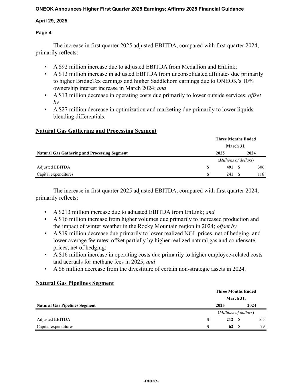 ONEOK Announces Higher First Quarter 2025 Earnings; Affirms 2025 Financial Guidance April 29, 2025 Page 4 -more- The increase in first quarter 2025 adjusted EBITDA, compared with first quarter 2024, primarily reflects: • A $92 million increase due to adjusted EBITDA from Medallion and EnLink; • A $13 million increase in adjusted EBITDA from unconsolidated affiliates due primarily to higher BridgeTex earnings and higher Saddlehorn earnings due to ONEOK’s 10% ownership interest increase in March 2024; and • A $13 million decrease in operating costs due primarily to lower outside services; offset by • A $27 million decrease in optimization and marketing due primarily to lower liquids blending differentials. Natural Gas Gathering and Processing Segment Three Months Ended March 31, Natural Gas Gathering and Processing Segment 2025 2024 (Millions of dollars) Adjusted EBITDA $ 491 $ 306 Capital expenditures $ 241 $ 116 The increase in first quarter 2025 adjusted EBITDA, compared with first quarter 2024, primarily reflects: • A $213 million increase due to adjusted EBITDA from EnLink; and • A $16 million increase from higher volumes due primarily to increased production and the impact of winter weather in the Rocky Mountain region in 2024; offset by • A $19 million decrease due primarily to lower realized NGL prices, net of hedging, and lower average fee rates; offset partially by higher realized natural gas and condensate prices, net of hedging; • A $16 million increase in operating costs due primarily to higher employee-related costs and accruals for methane fees in 2025; and • A $6 million decrease from the divestiture of certain non-strategic assets in 2024. Natural Gas Pipelines Segment Three Months Ended March 31, Natural Gas Pipelines Segment 2025 2024 (Millions of dollars) Adjusted EBITDA $ 212 $ 165 Capital expenditures $ 62 $ 79