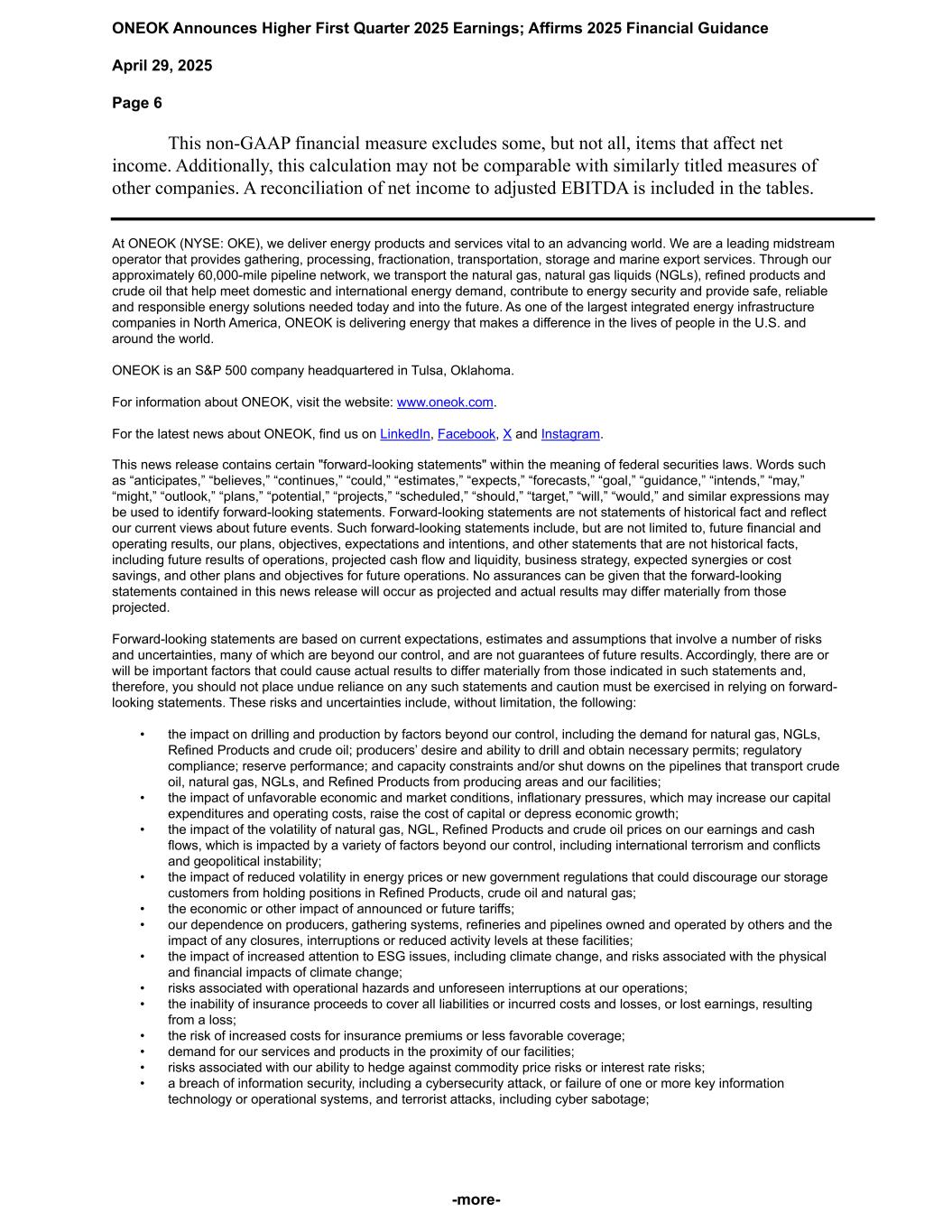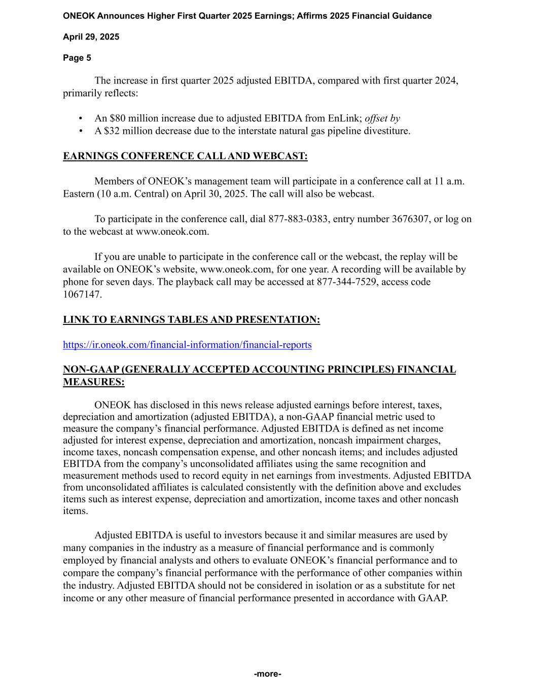 ONEOK Announces Higher First Quarter 2025 Earnings; Affirms 2025 Financial Guidance April 29, 2025 Page 5 -more- The increase in first quarter 2025 adjusted EBITDA, compared with first quarter 2024, primarily reflects: • An $80 million increase due to adjusted EBITDA from EnLink; offset by • A $32 million decrease due to the interstate natural gas pipeline divestiture. EARNINGS CONFERENCE CALL AND WEBCAST: Members of ONEOK’s management team will participate in a conference call at 11 a.m. Eastern (10 a.m. Central) on April 30, 2025. The call will also be webcast. To participate in the conference call, dial 877-883-0383, entry number 3676307, or log on to the webcast at www.oneok.com. If you are unable to participate in the conference call or the webcast, the replay will be available on ONEOK’s website, www.oneok.com, for one year. A recording will be available by phone for seven days. The playback call may be accessed at 877-344-7529, access code 1067147. LINK TO EARNINGS TABLES AND PRESENTATION: https://ir.oneok.com/financial-information/financial-reports NON-GAAP (GENERALLY ACCEPTED ACCOUNTING PRINCIPLES) FINANCIAL MEASURES: ONEOK has disclosed in this news release adjusted earnings before interest, taxes, depreciation and amortization (adjusted EBITDA), a non-GAAP financial metric used to measure the company’s financial performance. Adjusted EBITDA is defined as net income adjusted for interest expense, depreciation and amortization, noncash impairment charges, income taxes, noncash compensation expense, and other noncash items; and includes adjusted EBITDA from the company’s unconsolidated affiliates using the same recognition and measurement methods used to record equity in net earnings from investments. Adjusted EBITDA from unconsolidated affiliates is calculated consistently with the definition above and excludes items such as interest expense, depreciation and amortization, income taxes and other noncash items. Adjusted EBITDA is useful to investors because it and similar measures are used by many companies in the industry as a measure of financial performance and is commonly employed by financial analysts and others to evaluate ONEOK’s financial performance and to compare the company’s financial performance with the performance of other companies within the industry. Adjusted EBITDA should not be considered in isolation or as a substitute for net income or any other measure of financial performance presented in accordance with GAAP.