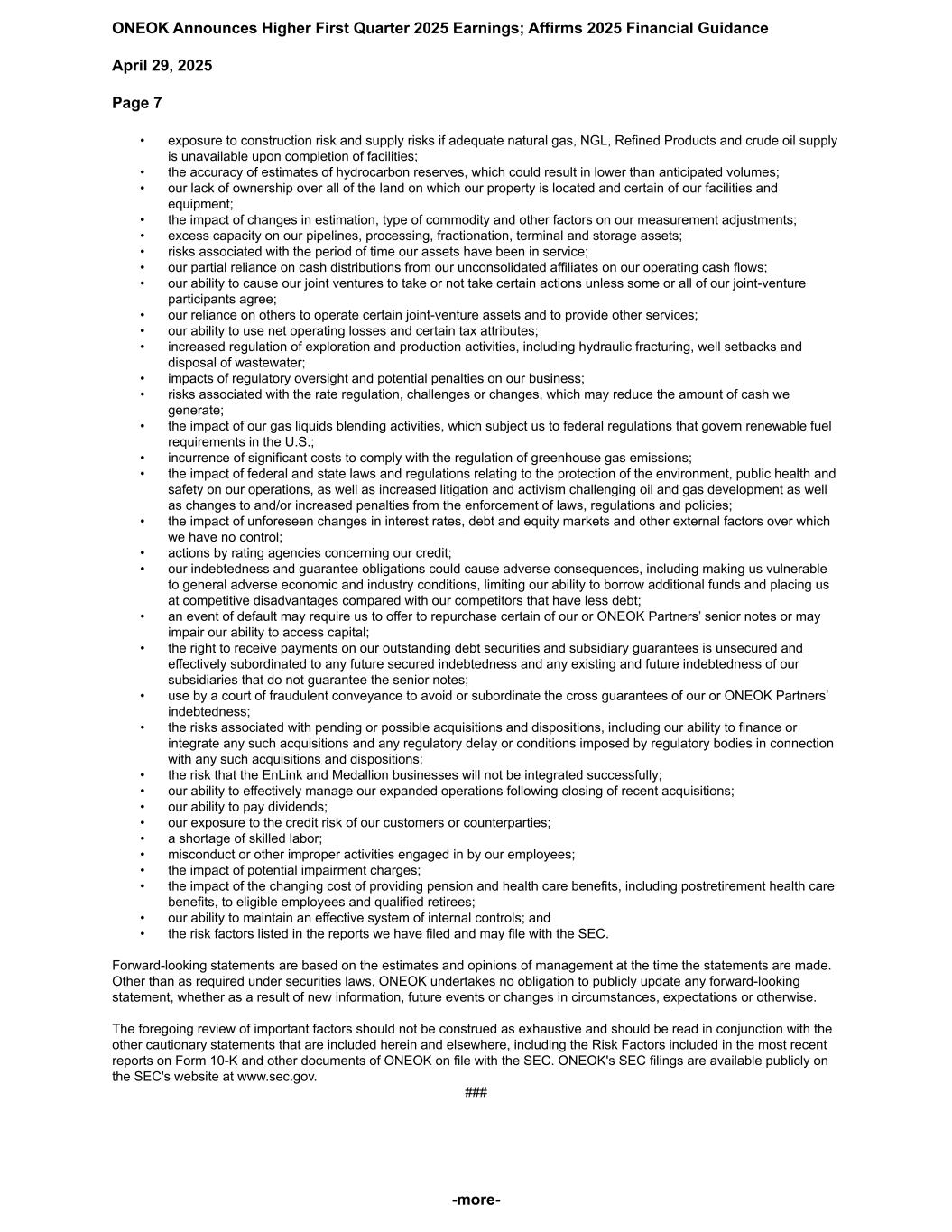 ONEOK Announces Higher First Quarter 2025 Earnings; Affirms 2025 Financial Guidance April 29, 2025 Page 7 -more- • exposure to construction risk and supply risks if adequate natural gas, NGL, Refined Products and crude oil supply is unavailable upon completion of facilities; • the accuracy of estimates of hydrocarbon reserves, which could result in lower than anticipated volumes; • our lack of ownership over all of the land on which our property is located and certain of our facilities and equipment; • the impact of changes in estimation, type of commodity and other factors on our measurement adjustments; • excess capacity on our pipelines, processing, fractionation, terminal and storage assets; • risks associated with the period of time our assets have been in service; • our partial reliance on cash distributions from our unconsolidated affiliates on our operating cash flows; • our ability to cause our joint ventures to take or not take certain actions unless some or all of our joint-venture participants agree; • our reliance on others to operate certain joint-venture assets and to provide other services; • our ability to use net operating losses and certain tax attributes; • increased regulation of exploration and production activities, including hydraulic fracturing, well setbacks and disposal of wastewater; • impacts of regulatory oversight and potential penalties on our business; • risks associated with the rate regulation, challenges or changes, which may reduce the amount of cash we generate; • the impact of our gas liquids blending activities, which subject us to federal regulations that govern renewable fuel requirements in the U.S.; • incurrence of significant costs to comply with the regulation of greenhouse gas emissions; • the impact of federal and state laws and regulations relating to the protection of the environment, public health and safety on our operations, as well as increased litigation and activism challenging oil and gas development as well as changes to and/or increased penalties from the enforcement of laws, regulations and policies; • the impact of unforeseen changes in interest rates, debt and equity markets and other external factors over which we have no control; • actions by rating agencies concerning our credit; • our indebtedness and guarantee obligations could cause adverse consequences, including making us vulnerable to general adverse economic and industry conditions, limiting our ability to borrow additional funds and placing us at competitive disadvantages compared with our competitors that have less debt; • an event of default may require us to offer to repurchase certain of our or ONEOK Partners’ senior notes or may impair our ability to access capital; • the right to receive payments on our outstanding debt securities and subsidiary guarantees is unsecured and effectively subordinated to any future secured indebtedness and any existing and future indebtedness of our subsidiaries that do not guarantee the senior notes; • use by a court of fraudulent conveyance to avoid or subordinate the cross guarantees of our or ONEOK Partners’ indebtedness; • the risks associated with pending or possible acquisitions and dispositions, including our ability to finance or integrate any such acquisitions and any regulatory delay or conditions imposed by regulatory bodies in connection with any such acquisitions and dispositions; • the risk that the EnLink and Medallion businesses will not be integrated successfully; • our ability to effectively manage our expanded operations following closing of recent acquisitions; • our ability to pay dividends; • our exposure to the credit risk of our customers or counterparties; • a shortage of skilled labor; • misconduct or other improper activities engaged in by our employees; • the impact of potential impairment charges; • the impact of the changing cost of providing pension and health care benefits, including postretirement health care benefits, to eligible employees and qualified retirees; • our ability to maintain an effective system of internal controls; and • the risk factors listed in the reports we have filed and may file with the SEC. Forward-looking statements are based on the estimates and opinions of management at the time the statements are made. Other than as required under securities laws, ONEOK undertakes no obligation to publicly update any forward-looking statement, whether as a result of new information, future events or changes in circumstances, expectations or otherwise. The foregoing review of important factors should not be construed as exhaustive and should be read in conjunction with the other cautionary statements that are included herein and elsewhere, including the Risk Factors included in the most recent reports on Form 10-K and other documents of ONEOK on file with the SEC. ONEOK's SEC filings are available publicly on the SEC's website at www.sec.gov. ###