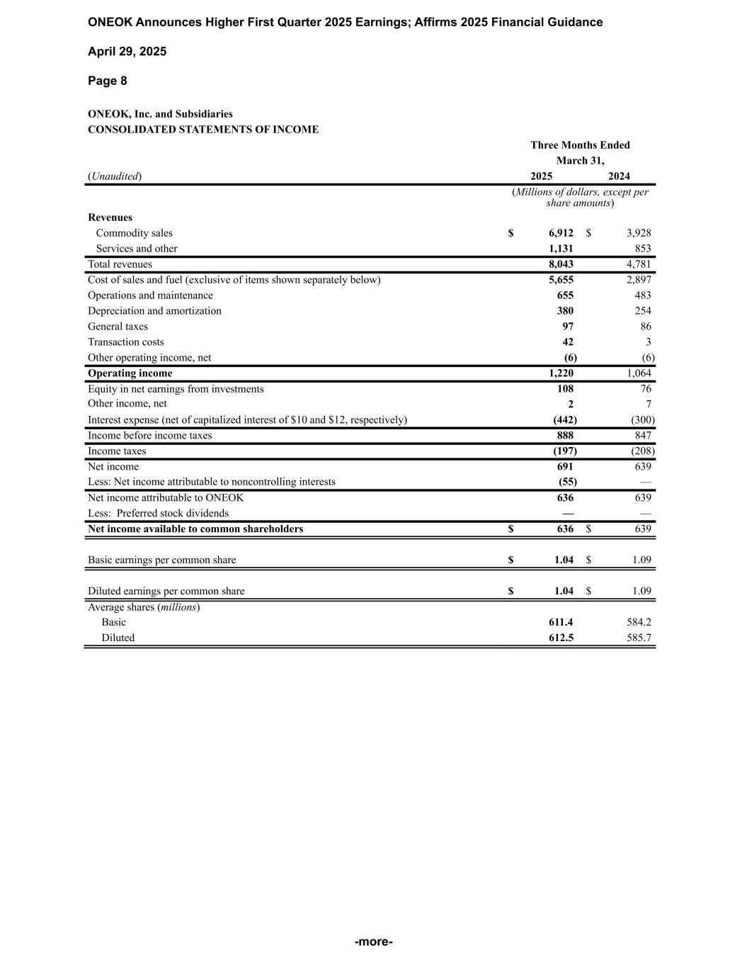 ONEOK Announces Higher First Quarter 2025 Earnings; Affirms 2025 Financial Guidance April 29, 2025 Page 8 -more- ONEOK, Inc. and Subsidiaries CONSOLIDATED STATEMENTS OF INCOME Three Months Ended March 31, (Unaudited) 2025 2024 (Millions of dollars, except per share amounts) Revenues Commodity sales $ 6,912 $ 3,928 Services and other 1,131 853 Total revenues 8,043 4,781 Cost of sales and fuel (exclusive of items shown separately below) 5,655 2,897 Operations and maintenance 655 483 Depreciation and amortization 380 254 General taxes 97 86 Transaction costs 42 3 Other operating income, net (6) (6) Operating income 1,220 1,064 Equity in net earnings from investments 108 76 Other income, net 2 7 Interest expense (net of capitalized interest of $10 and $12, respectively) (442) (300) Income before income taxes 888 847 Income taxes (197) (208) Net income 691 639 Less: Net income attributable to noncontrolling interests (55) — Net income attributable to ONEOK 636 639 Less: Preferred stock dividends — — Net income available to common shareholders $ 636 $ 639 Basic earnings per common share $ 1.04 $ 1.09 Diluted earnings per common share $ 1.04 $ 1.09 Average shares (millions) Basic 611.4 584.2 Diluted 612.5 585.7