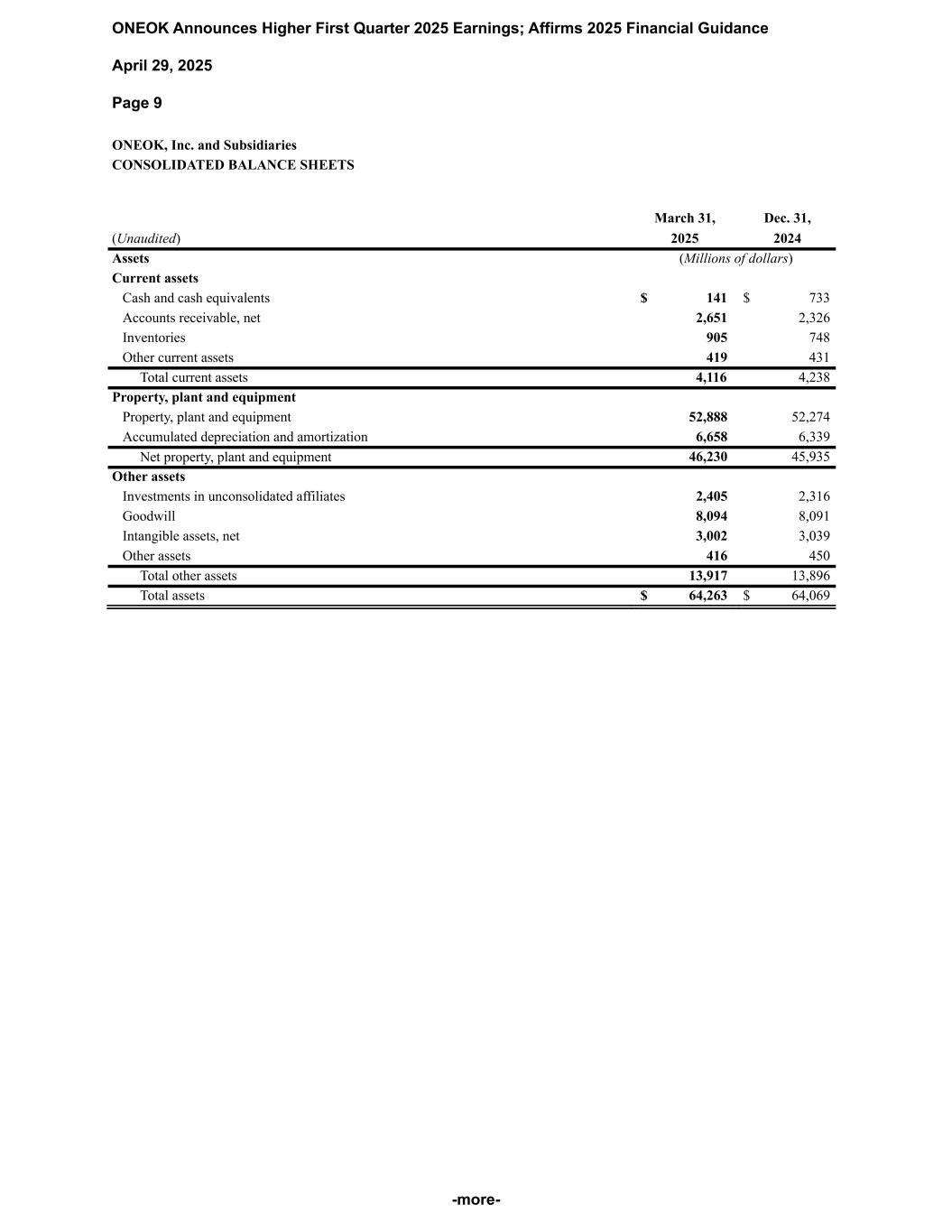 ONEOK Announces Higher First Quarter 2025 Earnings; Affirms 2025 Financial Guidance April 29, 2025 Page 9 -more- ONEOK, Inc. and Subsidiaries CONSOLIDATED BALANCE SHEETS March 31, Dec. 31, (Unaudited) 2025 2024 Assets (Millions of dollars) Current assets Cash and cash equivalents $ 141 $ 733 Accounts receivable, net 2,651 2,326 Inventories 905 748 Other current assets 419 431 Total current assets 4,116 4,238 Property, plant and equipment Property, plant and equipment 52,888 52,274 Accumulated depreciation and amortization 6,658 6,339 Net property, plant and equipment 46,230 45,935 Other assets Investments in unconsolidated affiliates 2,405 2,316 Goodwill 8,094 8,091 Intangible assets, net 3,002 3,039 Other assets 416 450 Total other assets 13,917 13,896 Total assets $ 64,263 $ 64,069