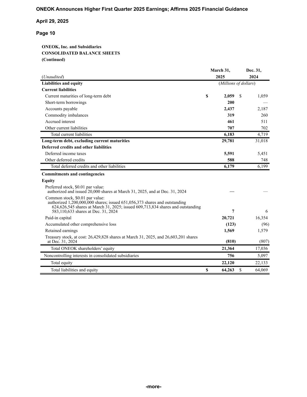 ONEOK Announces Higher First Quarter 2025 Earnings; Affirms 2025 Financial Guidance April 29, 2025 Page 10 -more- ONEOK, Inc. and Subsidiaries CONSOLIDATED BALANCE SHEETS (Continued) March 31, Dec. 31, (Unaudited) 2025 2024 Liabilities and equity (Millions of dollars) Current liabilities Current maturities of long-term debt $ 2,059 $ 1,059 Short-term borrowings 200 — Accounts payable 2,437 2,187 Commodity imbalances 319 260 Accrued interest 461 511 Other current liabilities 707 702 Total current liabilities 6,183 4,719 Long-term debt, excluding current maturities 29,781 31,018 Deferred credits and other liabilities Deferred income taxes 5,591 5,451 Other deferred credits 588 748 Total deferred credits and other liabilities 6,179 6,199 Commitments and contingencies Equity Preferred stock, $0.01 par value: authorized and issued 20,000 shares at March 31, 2025, and at Dec. 31, 2024 — — Common stock, $0.01 par value: authorized 1,200,000,000 shares; issued 651,056,373 shares and outstanding 624,626,545 shares at March 31, 2025; issued 609,713,834 shares and outstanding 583,110,633 shares at Dec. 31, 2024 7 6 Paid-in capital 20,721 16,354 Accumulated other comprehensive loss (123) (96) Retained earnings 1,569 1,579 Treasury stock, at cost: 26,429,828 shares at March 31, 2025, and 26,603,201 shares at Dec. 31, 2024 (810) (807) Total ONEOK shareholders’ equity 21,364 17,036 Noncontrolling interests in consolidated subsidiaries 756 5,097 Total equity 22,120 22,133 Total liabilities and equity $ 64,263 $ 64,069