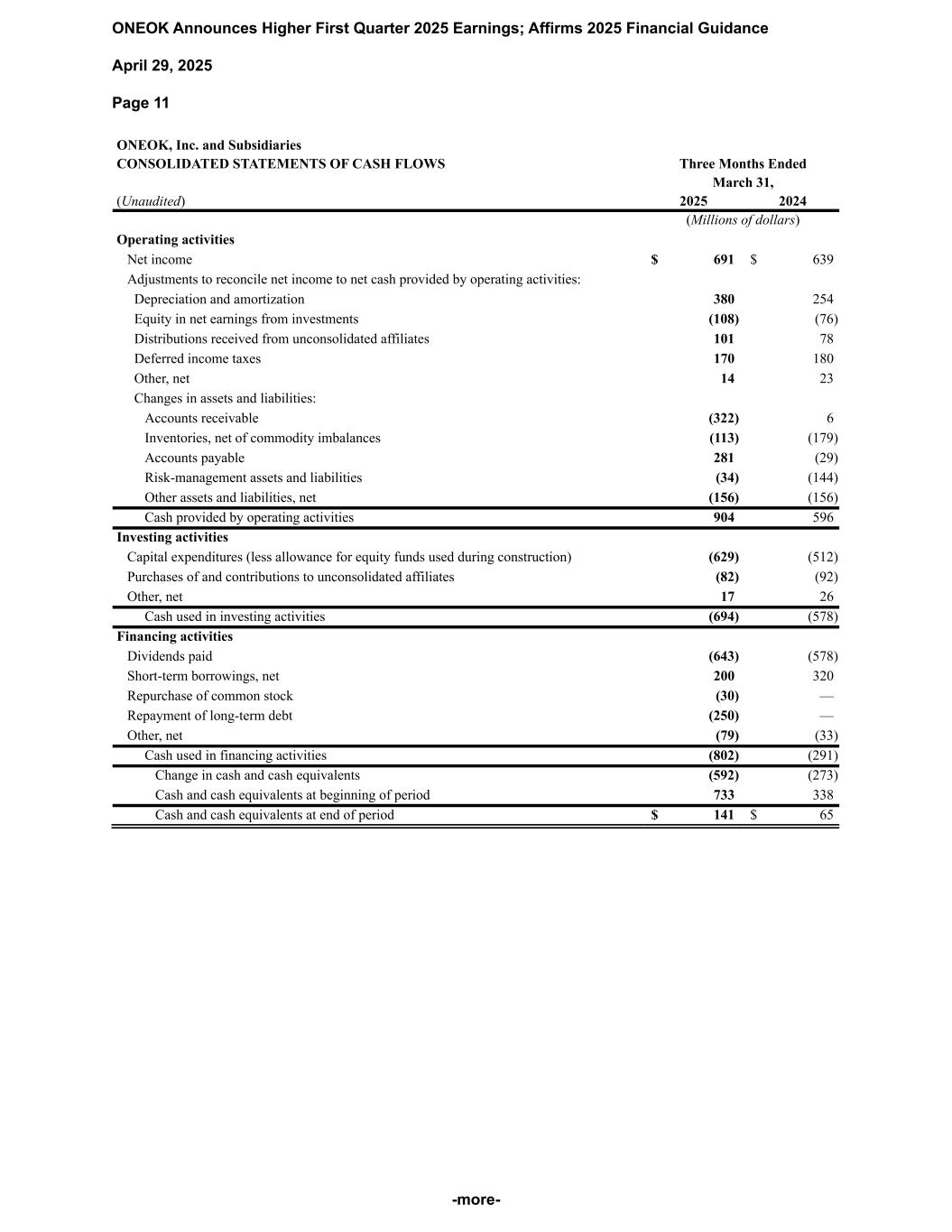ONEOK Announces Higher First Quarter 2025 Earnings; Affirms 2025 Financial Guidance April 29, 2025 Page 11 -more- ONEOK, Inc. and Subsidiaries CONSOLIDATED STATEMENTS OF CASH FLOWS Three Months Ended March 31, (Unaudited) 2025 2024 (Millions of dollars) Operating activities Net income $ 691 $ 639 Adjustments to reconcile net income to net cash provided by operating activities: Depreciation and amortization 380 254 Equity in net earnings from investments (108) (76) Distributions received from unconsolidated affiliates 101 78 Deferred income taxes 170 180 Other, net 14 23 Changes in assets and liabilities: Accounts receivable (322) 6 Inventories, net of commodity imbalances (113) (179) Accounts payable 281 (29) Risk-management assets and liabilities (34) (144) Other assets and liabilities, net (156) (156) Cash provided by operating activities 904 596 Investing activities Capital expenditures (less allowance for equity funds used during construction) (629) (512) Purchases of and contributions to unconsolidated affiliates (82) (92) Other, net 17 26 Cash used in investing activities (694) (578) Financing activities Dividends paid (643) (578) Short-term borrowings, net 200 320 Repurchase of common stock (30) — Repayment of long-term debt (250) — Other, net (79) (33) Cash used in financing activities (802) (291) Change in cash and cash equivalents (592) (273) Cash and cash equivalents at beginning of period 733 338 Cash and cash equivalents at end of period $ 141 $ 65