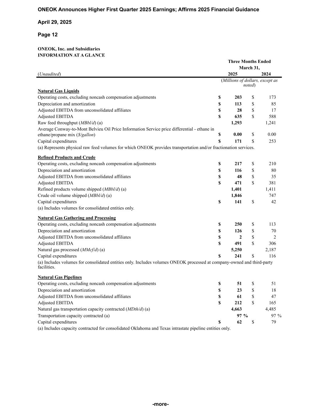 ONEOK Announces Higher First Quarter 2025 Earnings; Affirms 2025 Financial Guidance April 29, 2025 Page 12 -more- ONEOK, Inc. and Subsidiaries INFORMATION AT A GLANCE Three Months Ended March 31, (Unaudited) 2025 2024 (Millions of dollars, except as noted) Natural Gas Liquids Operating costs, excluding noncash compensation adjustments $ 203 $ 173 Depreciation and amortization $ 113 $ 85 Adjusted EBITDA from unconsolidated affiliates $ 28 $ 17 Adjusted EBITDA $ 635 $ 588 Raw feed throughput (MBbl/d) (a) 1,293 1,241 Average Conway-to-Mont Belvieu Oil Price Information Service price differential - ethane in ethane/propane mix ($/gallon) $ 0.00 $ 0.00 Capital expenditures $ 171 $ 253 (a) Represents physical raw feed volumes for which ONEOK provides transportation and/or fractionation services. Refined Products and Crude Operating costs, excluding noncash compensation adjustments $ 217 $ 210 Depreciation and amortization $ 116 $ 80 Adjusted EBITDA from unconsolidated affiliates $ 48 $ 35 Adjusted EBITDA $ 471 $ 381 Refined products volume shipped (MBbl/d) (a) 1,401 1,411 Crude oil volume shipped (MBbl/d) (a) 1,846 747 Capital expenditures $ 141 $ 42 (a) Includes volumes for consolidated entities only. Natural Gas Gathering and Processing Operating costs, excluding noncash compensation adjustments $ 250 $ 113 Depreciation and amortization $ 126 $ 70 Adjusted EBITDA from unconsolidated affiliates $ 2 $ 2 Adjusted EBITDA $ 491 $ 306 Natural gas processed (MMcf/d) (a) 5,250 2,187 Capital expenditures $ 241 $ 116 (a) Includes volumes for consolidated entities only. Includes volumes ONEOK processed at company-owned and third-party facilities. Natural Gas Pipelines Operating costs, excluding noncash compensation adjustments $ 51 $ 51 Depreciation and amortization $ 23 $ 18 Adjusted EBITDA from unconsolidated affiliates $ 61 $ 47 Adjusted EBITDA $ 212 $ 165 Natural gas transportation capacity contracted (MDth/d) (a) 4,663 4,485 Transportation capacity contracted (a) 97 % 97 % Capital expenditures $ 62 $ 79 (a) Includes capacity contracted for consolidated Oklahoma and Texas intrastate pipeline entities only.