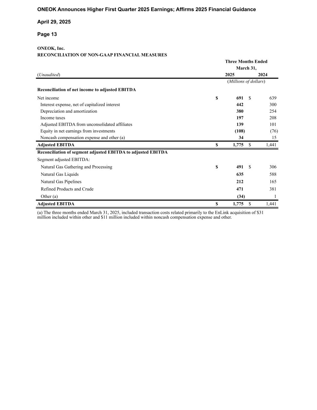 ONEOK Announces Higher First Quarter 2025 Earnings; Affirms 2025 Financial Guidance April 29, 2025 Page 13 -more- ONEOK, Inc. RECONCILIATION OF NON-GAAP FINANCIAL MEASURES Three Months Ended March 31, (Unaudited) 2025 2024 (Millions of dollars) Reconciliation of net income to adjusted EBITDA Net income $ 691 $ 639 Interest expense, net of capitalized interest 442 300 Depreciation and amortization 380 254 Income taxes 197 208 Adjusted EBITDA from unconsolidated affiliates 139 101 Equity in net earnings from investments (108) (76) Noncash compensation expense and other (a) 34 15 Adjusted EBITDA $ 1,775 $ 1,441 Reconciliation of segment adjusted EBITDA to adjusted EBITDA Segment adjusted EBITDA: Natural Gas Gathering and Processing $ 491 $ 306 Natural Gas Liquids 635 588 Natural Gas Pipelines 212 165 Refined Products and Crude 471 381 Other (a) (34) 1 Adjusted EBITDA $ 1,775 $ 1,441 (a) The three months ended March 31, 2025, included transaction costs related primarily to the EnLink acquisition of $31 million included within other and $11 million included within noncash compensation expense and other.