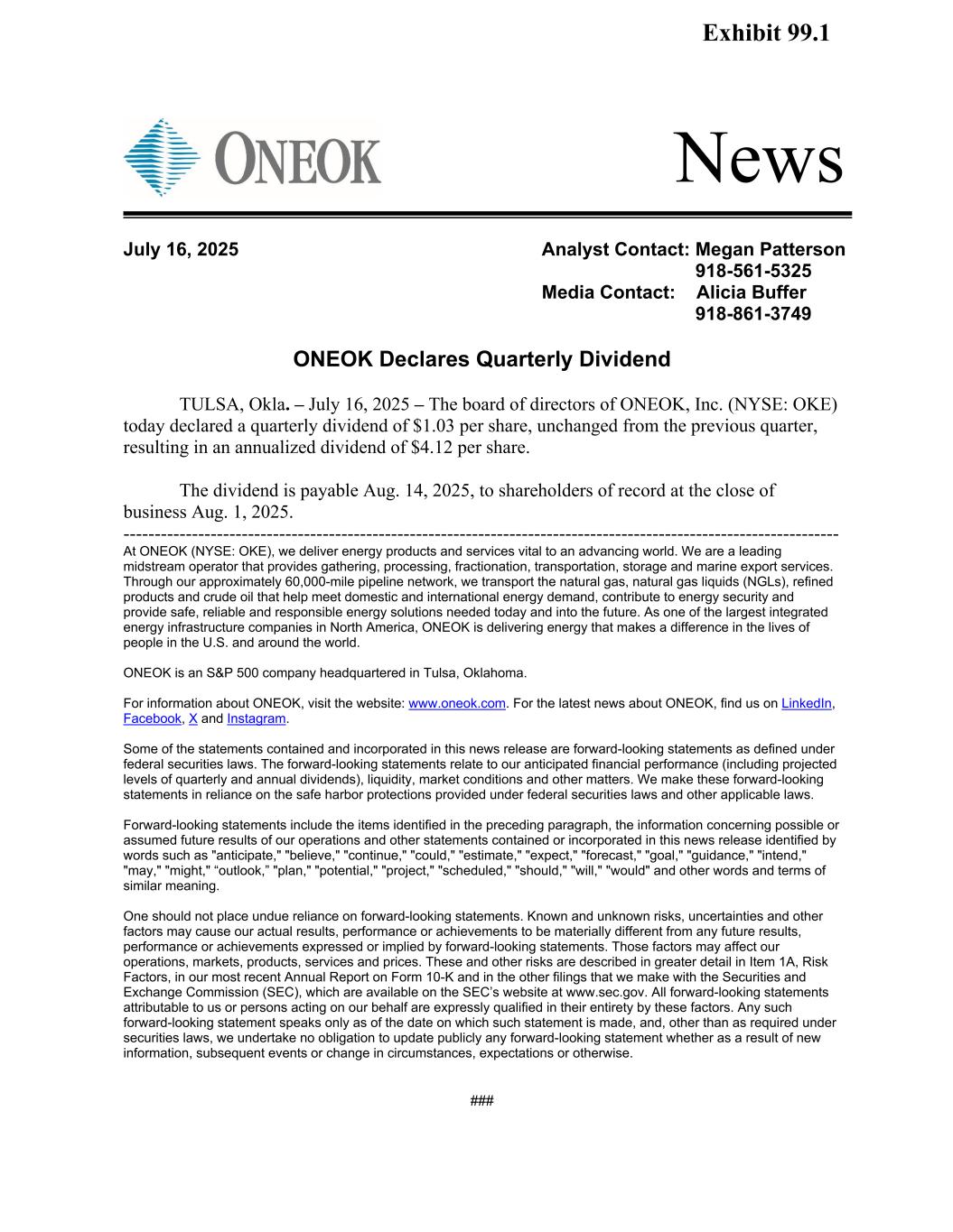 News ONEOK Declares Quarterly Dividend TULSA, Okla. – July 16, 2025 – The board of directors of ONEOK, Inc. (NYSE: OKE) today declared a quarterly dividend of $1.03 per share, unchanged from the previous quarter, resulting in an annualized dividend of $4.12 per share. The dividend is payable Aug. 14, 2025, to shareholders of record at the close of business Aug. 1, 2025. ------------------------------------------------------------------------------------------------------------------- At ONEOK (NYSE: OKE), we deliver energy products and services vital to an advancing world. We are a leading midstream operator that provides gathering, processing, fractionation, transportation, storage and marine export services. Through our approximately 60,000-mile pipeline network, we transport the natural gas, natural gas liquids (NGLs), refined products and crude oil that help meet domestic and international energy demand, contribute to energy security and provide safe, reliable and responsible energy solutions needed today and into the future. As one of the largest integrated energy infrastructure companies in North America, ONEOK is delivering energy that makes a difference in the lives of people in the U.S. and around the world. ONEOK is an S&P 500 company headquartered in Tulsa, Oklahoma. For information about ONEOK, visit the website: www.oneok.com. For the latest news about ONEOK, find us on LinkedIn, Facebook, X and Instagram. Some of the statements contained and incorporated in this news release are forward-looking statements as defined under federal securities laws. The forward-looking statements relate to our anticipated financial performance (including projected levels of quarterly and annual dividends), liquidity, market conditions and other matters. We make these forward-looking statements in reliance on the safe harbor protections provided under federal securities laws and other applicable laws. Forward-looking statements include the items identified in the preceding paragraph, the information concerning possible or assumed future results of our operations and other statements contained or incorporated in this news release identified by words such as "anticipate," "believe," "continue," "could," "estimate," "expect," "forecast," "goal," "guidance," "intend," "may," "might," “outlook,” "plan," "potential," "project," "scheduled," "should," "will," "would" and other words and terms of similar meaning. One should not place undue reliance on forward-looking statements. Known and unknown risks, uncertainties and other factors may cause our actual results, performance or achievements to be materially different from any future results, performance or achievements expressed or implied by forward-looking statements. Those factors may affect our operations, markets, products, services and prices. These and other risks are described in greater detail in Item 1A, Risk Factors, in our most recent Annual Report on Form 10-K and in the other filings that we make with the Securities and Exchange Commission (SEC), which are available on the SEC’s website at www.sec.gov. All forward-looking statements attributable to us or persons acting on our behalf are expressly qualified in their entirety by these factors. Any such forward-looking statement speaks only as of the date on which such statement is made, and, other than as required under securities laws, we undertake no obligation to update publicly any forward-looking statement whether as a result of new information, subsequent events or change in circumstances, expectations or otherwise. ### July 16, 2025 Analyst Contact: Megan Patterson 918-561-5325 Media Contact: Alicia Buffer 918-861-3749 Exhibit 99.1
