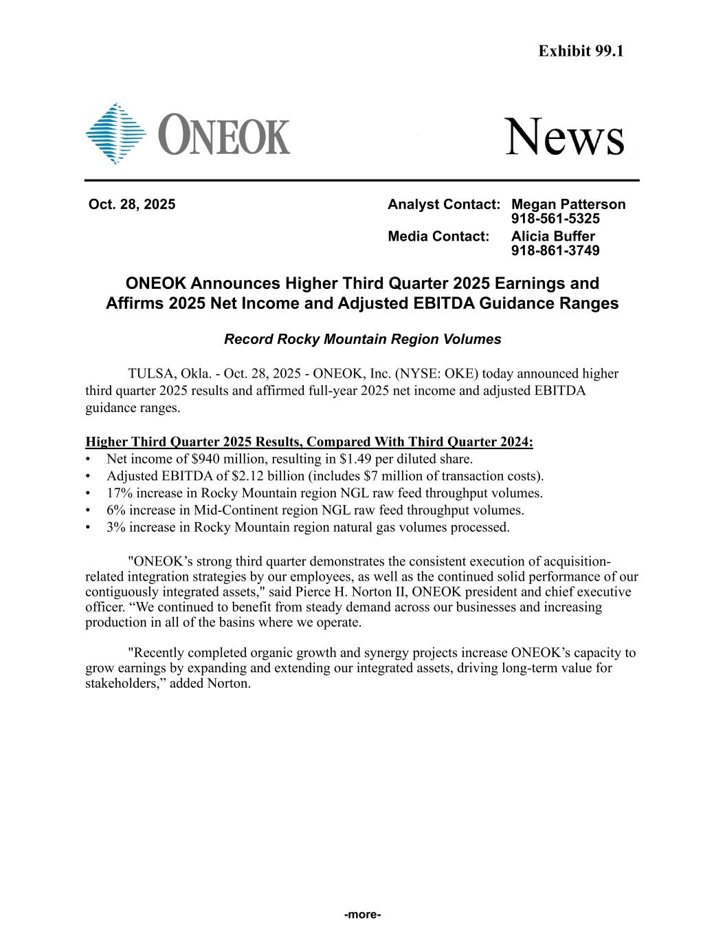 -more- Oct. 28, 2025 Analyst Contact: Megan Patterson 918-561-5325 Media Contact: Alicia Buffer 918-861-3749 ONEOK Announces Higher Third Quarter 2025 Earnings and Affirms 2025 Net Income and Adjusted EBITDA Guidance Ranges Record Rocky Mountain Region Volumes TULSA, Okla. - Oct. 28, 2025 - ONEOK, Inc. (NYSE: OKE) today announced higher third quarter 2025 results and affirmed full-year 2025 net income and adjusted EBITDA guidance ranges. Higher Third Quarter 2025 Results, Compared With Third Quarter 2024: • Net income of $940 million, resulting in $1.49 per diluted share. • Adjusted EBITDA of $2.12 billion (includes $7 million of transaction costs). • 17% increase in Rocky Mountain region NGL raw feed throughput volumes. • 6% increase in Mid-Continent region NGL raw feed throughput volumes. • 3% increase in Rocky Mountain region natural gas volumes processed. "ONEOK’s strong third quarter demonstrates the consistent execution of acquisition- related integration strategies by our employees, as well as the continued solid performance of our contiguously integrated assets," said Pierce H. Norton II, ONEOK president and chief executive officer. “We continued to benefit from steady demand across our businesses and increasing production in all of the basins where we operate. "Recently completed organic growth and synergy projects increase ONEOK’s capacity to grow earnings by expanding and extending our integrated assets, driving long-term value for stakeholders,” added Norton. Exhibit 99.1