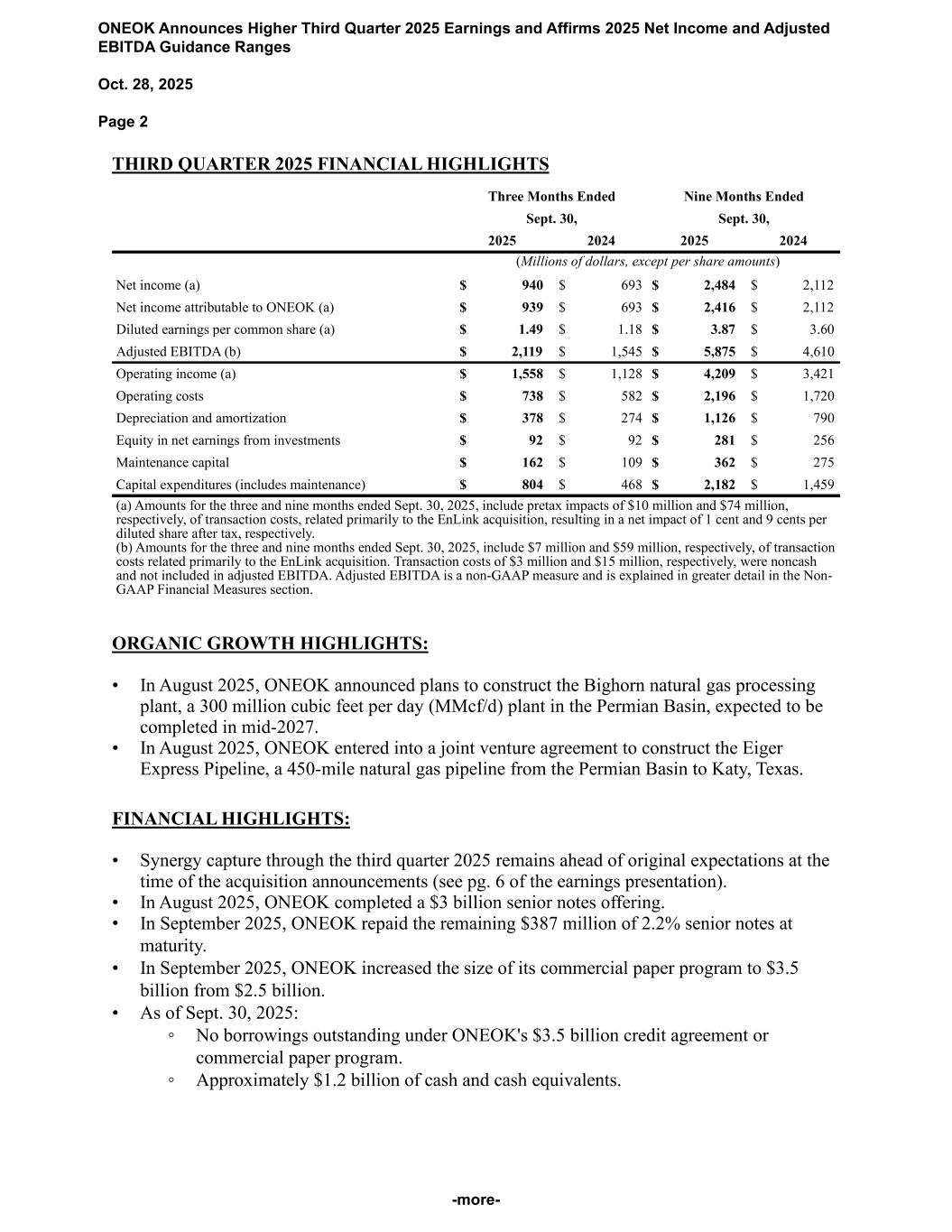 ONEOK Announces Higher Third Quarter 2025 Earnings and Affirms 2025 Net Income and Adjusted EBITDA Guidance Ranges Oct. 28, 2025 Page 2 -more- THIRD QUARTER 2025 FINANCIAL HIGHLIGHTS Three Months Ended Nine Months Ended Sept. 30, Sept. 30, 2025 2024 2025 2024 (Millions of dollars, except per share amounts) Net income (a) $ 940 $ 693 $ 2,484 $ 2,112 Net income attributable to ONEOK (a) $ 939 $ 693 $ 2,416 $ 2,112 Diluted earnings per common share (a) $ 1.49 $ 1.18 $ 3.87 $ 3.60 Adjusted EBITDA (b) $ 2,119 $ 1,545 $ 5,875 $ 4,610 Operating income (a) $ 1,558 $ 1,128 $ 4,209 $ 3,421 Operating costs $ 738 $ 582 $ 2,196 $ 1,720 Depreciation and amortization $ 378 $ 274 $ 1,126 $ 790 Equity in net earnings from investments $ 92 $ 92 $ 281 $ 256 Maintenance capital $ 162 $ 109 $ 362 $ 275 Capital expenditures (includes maintenance) $ 804 $ 468 $ 2,182 $ 1,459 (a) Amounts for the three and nine months ended Sept. 30, 2025, include pretax impacts of $10 million and $74 million, respectively, of transaction costs, related primarily to the EnLink acquisition, resulting in a net impact of 1 cent and 9 cents per diluted share after tax, respectively. (b) Amounts for the three and nine months ended Sept. 30, 2025, include $7 million and $59 million, respectively, of transaction costs related primarily to the EnLink acquisition. Transaction costs of $3 million and $15 million, respectively, were noncash and not included in adjusted EBITDA. Adjusted EBITDA is a non-GAAP measure and is explained in greater detail in the Non- GAAP Financial Measures section. ORGANIC GROWTH HIGHLIGHTS: • In August 2025, ONEOK announced plans to construct the Bighorn natural gas processing plant, a 300 million cubic feet per day (MMcf/d) plant in the Permian Basin, expected to be completed in mid-2027. • In August 2025, ONEOK entered into a joint venture agreement to construct the Eiger Express Pipeline, a 450-mile natural gas pipeline from the Permian Basin to Katy, Texas. FINANCIAL HIGHLIGHTS: • Synergy capture through the third quarter 2025 remains ahead of original expectations at the time of the acquisition announcements (see pg. 6 of the earnings presentation). • In August 2025, ONEOK completed a $3 billion senior notes offering. • In September 2025, ONEOK repaid the remaining $387 million of 2.2% senior notes at maturity. • In September 2025, ONEOK increased the size of its commercial paper program to $3.5 billion from $2.5 billion. • As of Sept. 30, 2025: ◦ No borrowings outstanding under ONEOK's $3.5 billion credit agreement or commercial paper program. ◦ Approximately $1.2 billion of cash and cash equivalents.