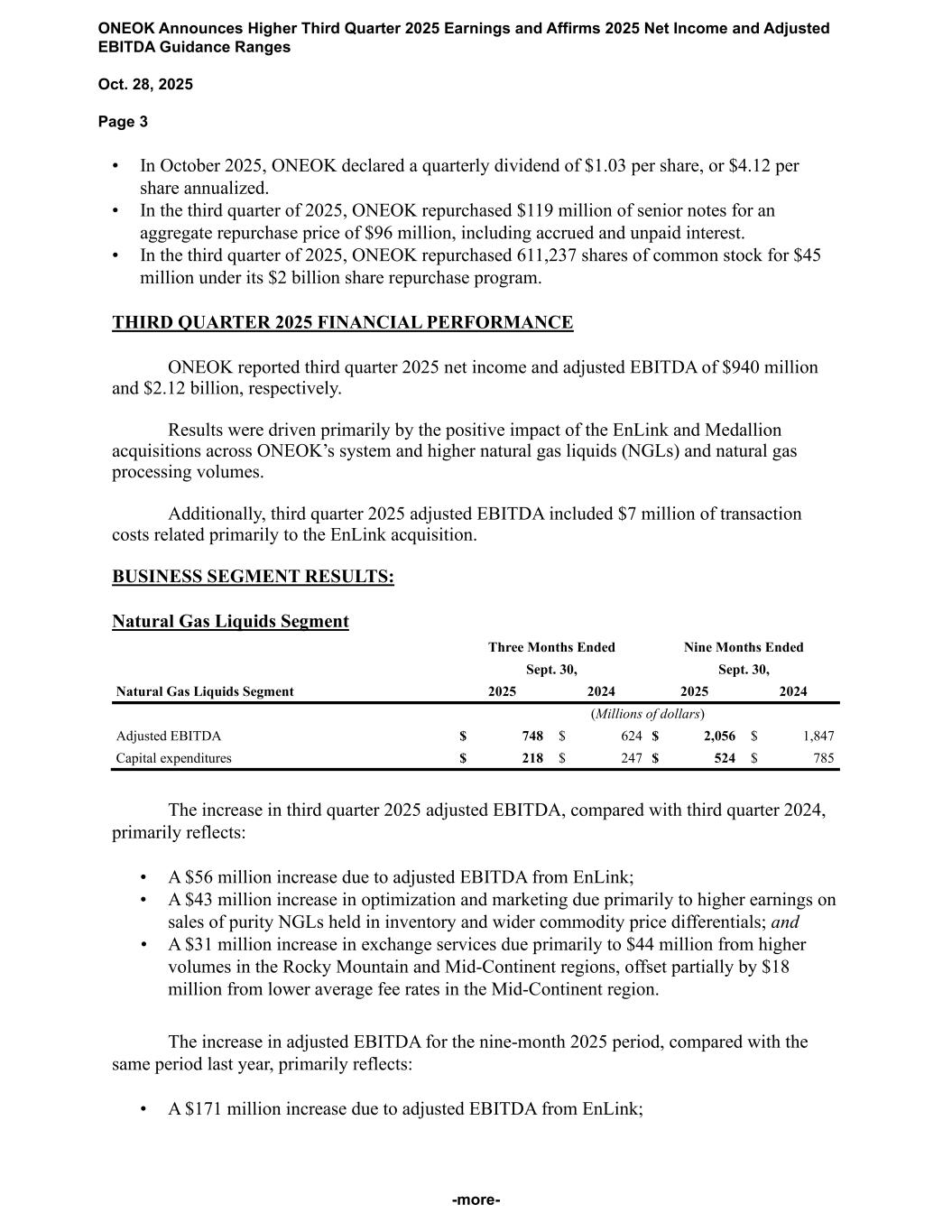 ONEOK Announces Higher Third Quarter 2025 Earnings and Affirms 2025 Net Income and Adjusted EBITDA Guidance Ranges Oct. 28, 2025 Page 3 -more- • In October 2025, ONEOK declared a quarterly dividend of $1.03 per share, or $4.12 per share annualized. • In the third quarter of 2025, ONEOK repurchased $119 million of senior notes for an aggregate repurchase price of $96 million, including accrued and unpaid interest. • In the third quarter of 2025, ONEOK repurchased 611,237 shares of common stock for $45 million under its $2 billion share repurchase program. THIRD QUARTER 2025 FINANCIAL PERFORMANCE ONEOK reported third quarter 2025 net income and adjusted EBITDA of $940 million and $2.12 billion, respectively. Results were driven primarily by the positive impact of the EnLink and Medallion acquisitions across ONEOK’s system and higher natural gas liquids (NGLs) and natural gas processing volumes. Additionally, third quarter 2025 adjusted EBITDA included $7 million of transaction costs related primarily to the EnLink acquisition. BUSINESS SEGMENT RESULTS: Natural Gas Liquids Segment Three Months Ended Nine Months Ended Sept. 30, Sept. 30, Natural Gas Liquids Segment 2025 2024 2025 2024 (Millions of dollars) Adjusted EBITDA $ 748 $ 624 $ 2,056 $ 1,847 Capital expenditures $ 218 $ 247 $ 524 $ 785 The increase in third quarter 2025 adjusted EBITDA, compared with third quarter 2024, primarily reflects: • A $56 million increase due to adjusted EBITDA from EnLink; • A $43 million increase in optimization and marketing due primarily to higher earnings on sales of purity NGLs held in inventory and wider commodity price differentials; and • A $31 million increase in exchange services due primarily to $44 million from higher volumes in the Rocky Mountain and Mid-Continent regions, offset partially by $18 million from lower average fee rates in the Mid-Continent region. The increase in adjusted EBITDA for the nine-month 2025 period, compared with the same period last year, primarily reflects: • A $171 million increase due to adjusted EBITDA from EnLink;