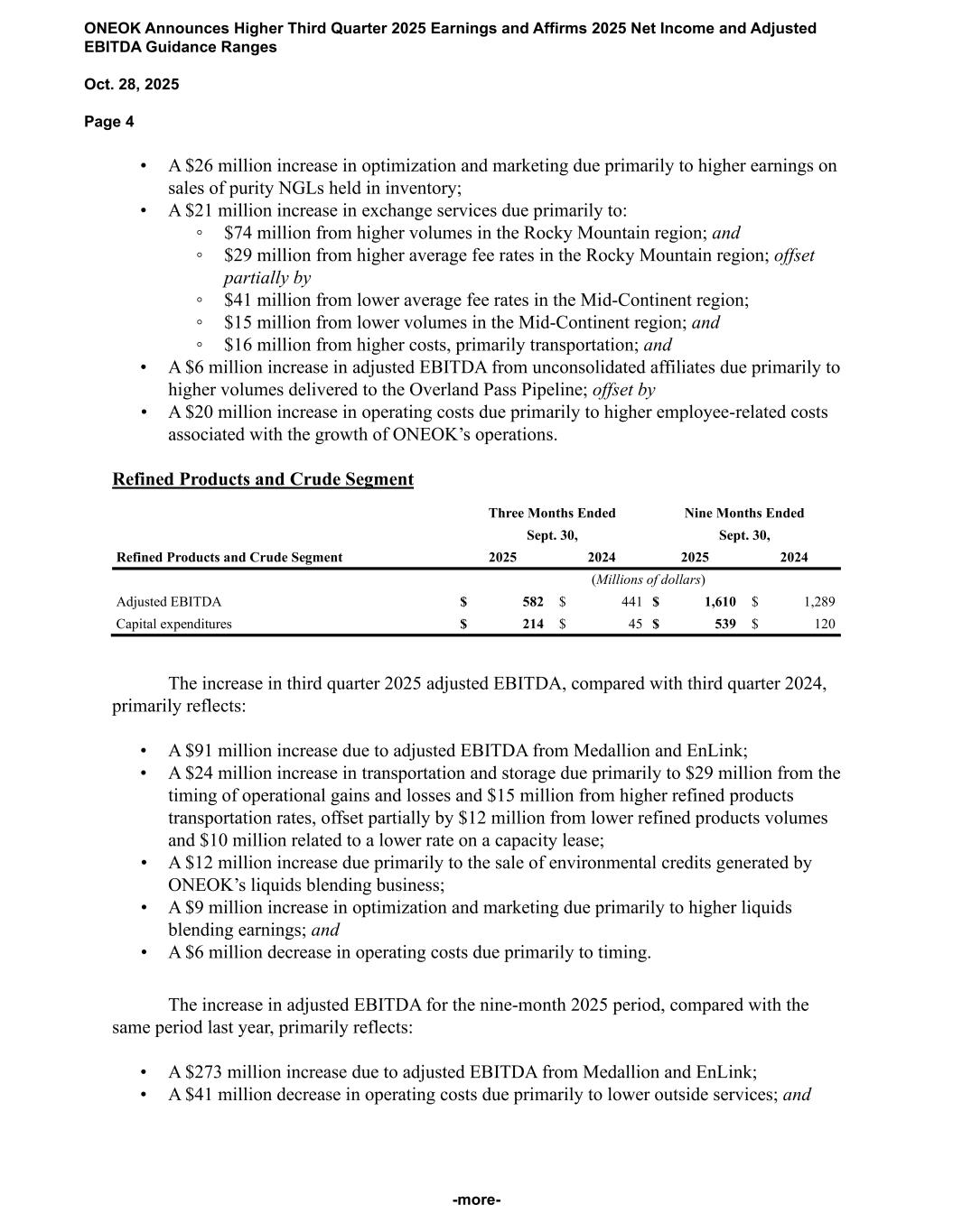 ONEOK Announces Higher Third Quarter 2025 Earnings and Affirms 2025 Net Income and Adjusted EBITDA Guidance Ranges Oct. 28, 2025 Page 4 -more- • A $26 million increase in optimization and marketing due primarily to higher earnings on sales of purity NGLs held in inventory; • A $21 million increase in exchange services due primarily to: ◦ $74 million from higher volumes in the Rocky Mountain region; and ◦ $29 million from higher average fee rates in the Rocky Mountain region; offset partially by ◦ $41 million from lower average fee rates in the Mid-Continent region; ◦ $15 million from lower volumes in the Mid-Continent region; and ◦ $16 million from higher costs, primarily transportation; and • A $6 million increase in adjusted EBITDA from unconsolidated affiliates due primarily to higher volumes delivered to the Overland Pass Pipeline; offset by • A $20 million increase in operating costs due primarily to higher employee-related costs associated with the growth of ONEOK’s operations. Refined Products and Crude Segment Three Months Ended Nine Months Ended Sept. 30, Sept. 30, Refined Products and Crude Segment 2025 2024 2025 2024 (Millions of dollars) Adjusted EBITDA $ 582 $ 441 $ 1,610 $ 1,289 Capital expenditures $ 214 $ 45 $ 539 $ 120 The increase in third quarter 2025 adjusted EBITDA, compared with third quarter 2024, primarily reflects: • A $91 million increase due to adjusted EBITDA from Medallion and EnLink; • A $24 million increase in transportation and storage due primarily to $29 million from the timing of operational gains and losses and $15 million from higher refined products transportation rates, offset partially by $12 million from lower refined products volumes and $10 million related to a lower rate on a capacity lease; • A $12 million increase due primarily to the sale of environmental credits generated by ONEOK’s liquids blending business; • A $9 million increase in optimization and marketing due primarily to higher liquids blending earnings; and • A $6 million decrease in operating costs due primarily to timing. The increase in adjusted EBITDA for the nine-month 2025 period, compared with the same period last year, primarily reflects: • A $273 million increase due to adjusted EBITDA from Medallion and EnLink; • A $41 million decrease in operating costs due primarily to lower outside services; and