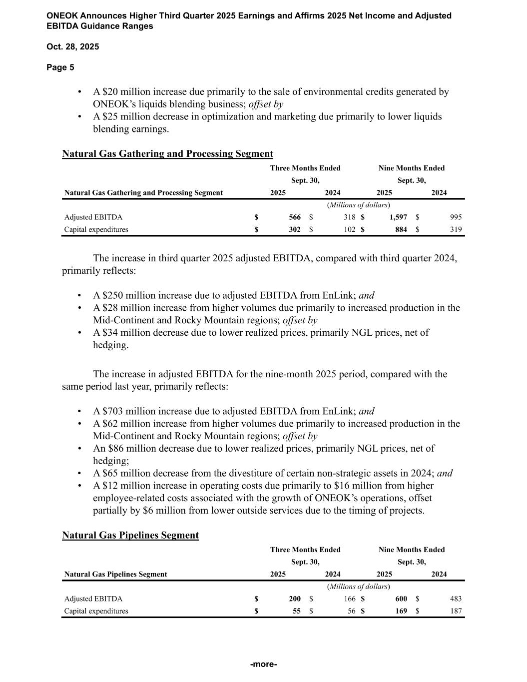 ONEOK Announces Higher Third Quarter 2025 Earnings and Affirms 2025 Net Income and Adjusted EBITDA Guidance Ranges Oct. 28, 2025 Page 5 -more- • A $20 million increase due primarily to the sale of environmental credits generated by ONEOK’s liquids blending business; offset by • A $25 million decrease in optimization and marketing due primarily to lower liquids blending earnings. Natural Gas Gathering and Processing Segment Three Months Ended Nine Months Ended Sept. 30, Sept. 30, Natural Gas Gathering and Processing Segment 2025 2024 2025 2024 (Millions of dollars) Adjusted EBITDA $ 566 $ 318 $ 1,597 $ 995 Capital expenditures $ 302 $ 102 $ 884 $ 319 The increase in third quarter 2025 adjusted EBITDA, compared with third quarter 2024, primarily reflects: • A $250 million increase due to adjusted EBITDA from EnLink; and • A $28 million increase from higher volumes due primarily to increased production in the Mid-Continent and Rocky Mountain regions; offset by • A $34 million decrease due to lower realized prices, primarily NGL prices, net of hedging. The increase in adjusted EBITDA for the nine-month 2025 period, compared with the same period last year, primarily reflects: • A $703 million increase due to adjusted EBITDA from EnLink; and • A $62 million increase from higher volumes due primarily to increased production in the Mid-Continent and Rocky Mountain regions; offset by • An $86 million decrease due to lower realized prices, primarily NGL prices, net of hedging; • A $65 million decrease from the divestiture of certain non-strategic assets in 2024; and • A $12 million increase in operating costs due primarily to $16 million from higher employee-related costs associated with the growth of ONEOK’s operations, offset partially by $6 million from lower outside services due to the timing of projects. Natural Gas Pipelines Segment Three Months Ended Nine Months Ended Sept. 30, Sept. 30, Natural Gas Pipelines Segment 2025 2024 2025 2024 (Millions of dollars) Adjusted EBITDA $ 200 $ 166 $ 600 $ 483 Capital expenditures $ 55 $ 56 $ 169 $ 187