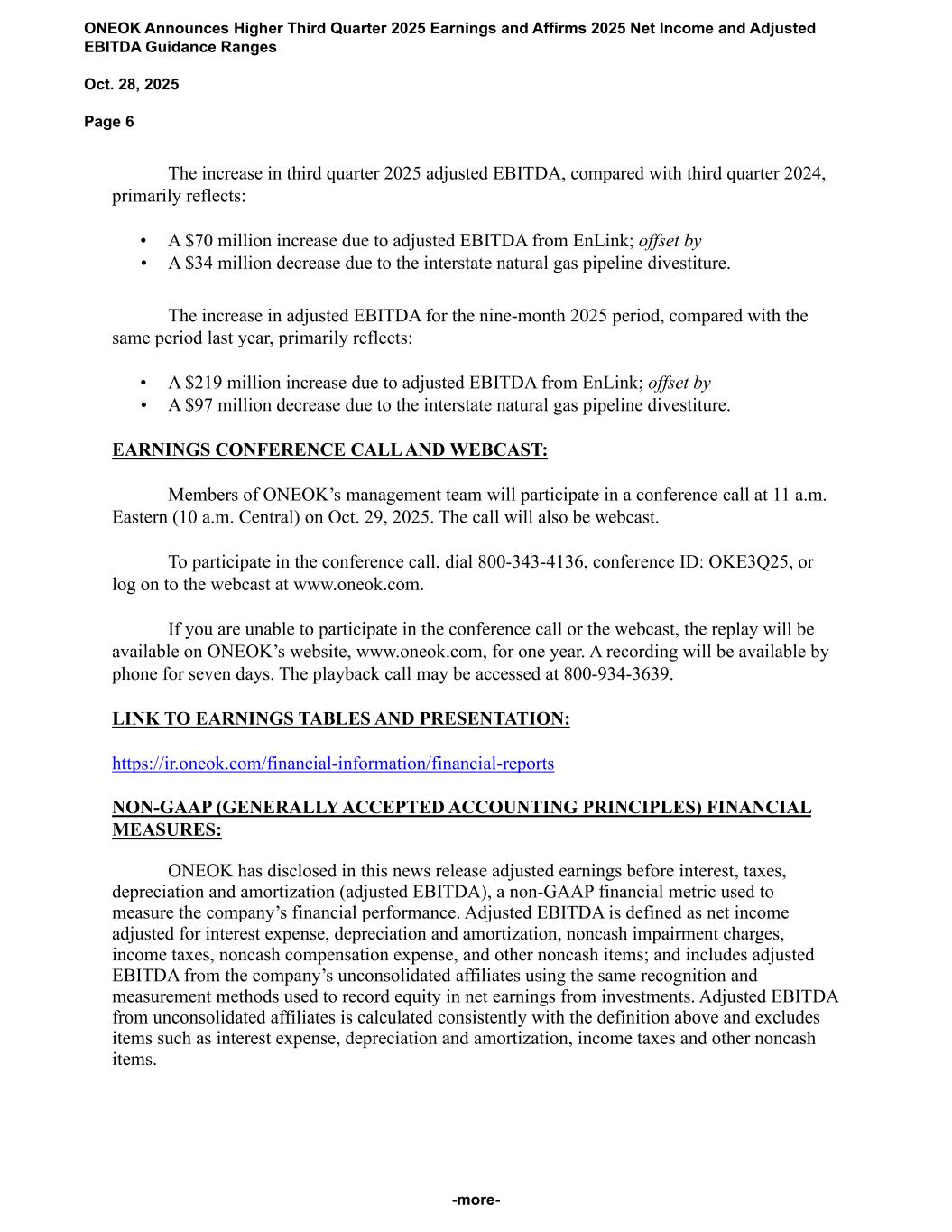 ONEOK Announces Higher Third Quarter 2025 Earnings and Affirms 2025 Net Income and Adjusted EBITDA Guidance Ranges Oct. 28, 2025 Page 6 -more- The increase in third quarter 2025 adjusted EBITDA, compared with third quarter 2024, primarily reflects: • A $70 million increase due to adjusted EBITDA from EnLink; offset by • A $34 million decrease due to the interstate natural gas pipeline divestiture. The increase in adjusted EBITDA for the nine-month 2025 period, compared with the same period last year, primarily reflects: • A $219 million increase due to adjusted EBITDA from EnLink; offset by • A $97 million decrease due to the interstate natural gas pipeline divestiture. EARNINGS CONFERENCE CALL AND WEBCAST: Members of ONEOK’s management team will participate in a conference call at 11 a.m. Eastern (10 a.m. Central) on Oct. 29, 2025. The call will also be webcast. To participate in the conference call, dial 800-343-4136, conference ID: OKE3Q25, or log on to the webcast at www.oneok.com. If you are unable to participate in the conference call or the webcast, the replay will be available on ONEOK’s website, www.oneok.com, for one year. A recording will be available by phone for seven days. The playback call may be accessed at 800-934-3639. LINK TO EARNINGS TABLES AND PRESENTATION: https://ir.oneok.com/financial-information/financial-reports NON-GAAP (GENERALLY ACCEPTED ACCOUNTING PRINCIPLES) FINANCIAL MEASURES: ONEOK has disclosed in this news release adjusted earnings before interest, taxes, depreciation and amortization (adjusted EBITDA), a non-GAAP financial metric used to measure the company’s financial performance. Adjusted EBITDA is defined as net income adjusted for interest expense, depreciation and amortization, noncash impairment charges, income taxes, noncash compensation expense, and other noncash items; and includes adjusted EBITDA from the company’s unconsolidated affiliates using the same recognition and measurement methods used to record equity in net earnings from investments. Adjusted EBITDA from unconsolidated affiliates is calculated consistently with the definition above and excludes items such as interest expense, depreciation and amortization, income taxes and other noncash items.