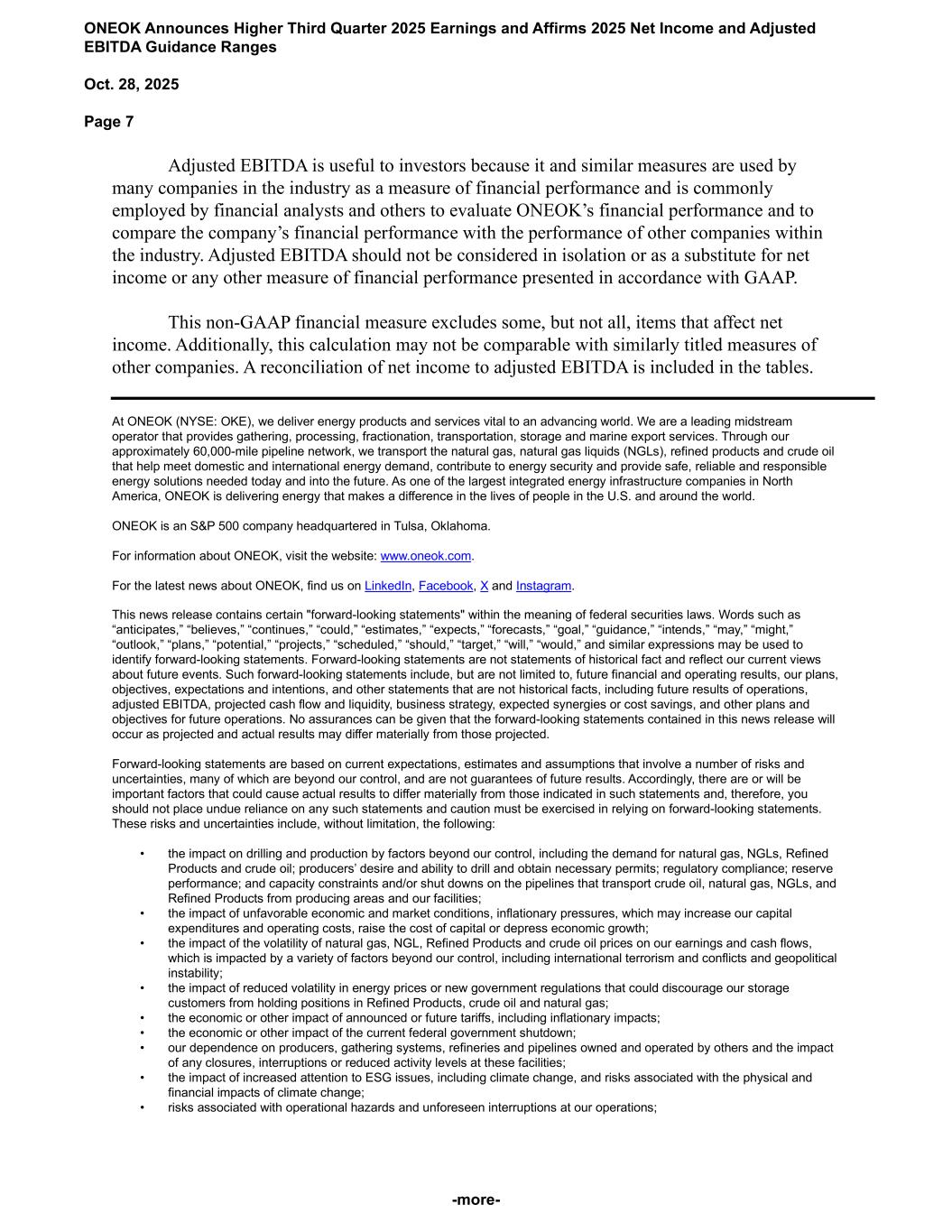 ONEOK Announces Higher Third Quarter 2025 Earnings and Affirms 2025 Net Income and Adjusted EBITDA Guidance Ranges Oct. 28, 2025 Page 7 -more- Adjusted EBITDA is useful to investors because it and similar measures are used by many companies in the industry as a measure of financial performance and is commonly employed by financial analysts and others to evaluate ONEOK’s financial performance and to compare the company’s financial performance with the performance of other companies within the industry. Adjusted EBITDA should not be considered in isolation or as a substitute for net income or any other measure of financial performance presented in accordance with GAAP. This non-GAAP financial measure excludes some, but not all, items that affect net income. Additionally, this calculation may not be comparable with similarly titled measures of other companies. A reconciliation of net income to adjusted EBITDA is included in the tables. At ONEOK (NYSE: OKE), we deliver energy products and services vital to an advancing world. We are a leading midstream operator that provides gathering, processing, fractionation, transportation, storage and marine export services. Through our approximately 60,000-mile pipeline network, we transport the natural gas, natural gas liquids (NGLs), refined products and crude oil that help meet domestic and international energy demand, contribute to energy security and provide safe, reliable and responsible energy solutions needed today and into the future. As one of the largest integrated energy infrastructure companies in North America, ONEOK is delivering energy that makes a difference in the lives of people in the U.S. and around the world. ONEOK is an S&P 500 company headquartered in Tulsa, Oklahoma. For information about ONEOK, visit the website: www.oneok.com. For the latest news about ONEOK, find us on LinkedIn, Facebook, X and Instagram. This news release contains certain "forward-looking statements" within the meaning of federal securities laws. Words such as “anticipates,” “believes,” “continues,” “could,” “estimates,” “expects,” “forecasts,” “goal,” “guidance,” “intends,” “may,” “might,” “outlook,” “plans,” “potential,” “projects,” “scheduled,” “should,” “target,” “will,” “would,” and similar expressions may be used to identify forward-looking statements. Forward-looking statements are not statements of historical fact and reflect our current views about future events. Such forward-looking statements include, but are not limited to, future financial and operating results, our plans, objectives, expectations and intentions, and other statements that are not historical facts, including future results of operations, adjusted EBITDA, projected cash flow and liquidity, business strategy, expected synergies or cost savings, and other plans and objectives for future operations. No assurances can be given that the forward-looking statements contained in this news release will occur as projected and actual results may differ materially from those projected. Forward-looking statements are based on current expectations, estimates and assumptions that involve a number of risks and uncertainties, many of which are beyond our control, and are not guarantees of future results. Accordingly, there are or will be important factors that could cause actual results to differ materially from those indicated in such statements and, therefore, you should not place undue reliance on any such statements and caution must be exercised in relying on forward-looking statements. These risks and uncertainties include, without limitation, the following: • the impact on drilling and production by factors beyond our control, including the demand for natural gas, NGLs, Refined Products and crude oil; producers’ desire and ability to drill and obtain necessary permits; regulatory compliance; reserve performance; and capacity constraints and/or shut downs on the pipelines that transport crude oil, natural gas, NGLs, and Refined Products from producing areas and our facilities; • the impact of unfavorable economic and market conditions, inflationary pressures, which may increase our capital expenditures and operating costs, raise the cost of capital or depress economic growth; • the impact of the volatility of natural gas, NGL, Refined Products and crude oil prices on our earnings and cash flows, which is impacted by a variety of factors beyond our control, including international terrorism and conflicts and geopolitical instability; • the impact of reduced volatility in energy prices or new government regulations that could discourage our storage customers from holding positions in Refined Products, crude oil and natural gas; • the economic or other impact of announced or future tariffs, including inflationary impacts; • the economic or other impact of the current federal government shutdown; • our dependence on producers, gathering systems, refineries and pipelines owned and operated by others and the impact of any closures, interruptions or reduced activity levels at these facilities; • the impact of increased attention to ESG issues, including climate change, and risks associated with the physical and financial impacts of climate change; • risks associated with operational hazards and unforeseen interruptions at our operations;