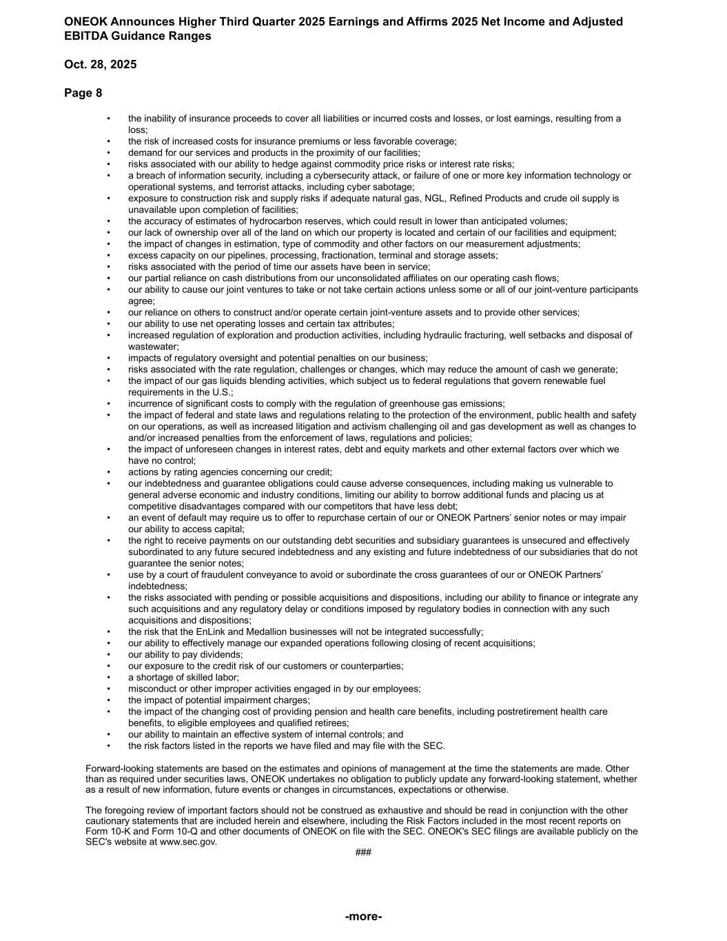 ONEOK Announces Higher Third Quarter 2025 Earnings and Affirms 2025 Net Income and Adjusted EBITDA Guidance Ranges Oct. 28, 2025 Page 8 -more- • the inability of insurance proceeds to cover all liabilities or incurred costs and losses, or lost earnings, resulting from a loss; • the risk of increased costs for insurance premiums or less favorable coverage; • demand for our services and products in the proximity of our facilities; • risks associated with our ability to hedge against commodity price risks or interest rate risks; • a breach of information security, including a cybersecurity attack, or failure of one or more key information technology or operational systems, and terrorist attacks, including cyber sabotage; • exposure to construction risk and supply risks if adequate natural gas, NGL, Refined Products and crude oil supply is unavailable upon completion of facilities; • the accuracy of estimates of hydrocarbon reserves, which could result in lower than anticipated volumes; • our lack of ownership over all of the land on which our property is located and certain of our facilities and equipment; • the impact of changes in estimation, type of commodity and other factors on our measurement adjustments; • excess capacity on our pipelines, processing, fractionation, terminal and storage assets; • risks associated with the period of time our assets have been in service; • our partial reliance on cash distributions from our unconsolidated affiliates on our operating cash flows; • our ability to cause our joint ventures to take or not take certain actions unless some or all of our joint-venture participants agree; • our reliance on others to construct and/or operate certain joint-venture assets and to provide other services; • our ability to use net operating losses and certain tax attributes; • increased regulation of exploration and production activities, including hydraulic fracturing, well setbacks and disposal of wastewater; • impacts of regulatory oversight and potential penalties on our business; • risks associated with the rate regulation, challenges or changes, which may reduce the amount of cash we generate; • the impact of our gas liquids blending activities, which subject us to federal regulations that govern renewable fuel requirements in the U.S.; • incurrence of significant costs to comply with the regulation of greenhouse gas emissions; • the impact of federal and state laws and regulations relating to the protection of the environment, public health and safety on our operations, as well as increased litigation and activism challenging oil and gas development as well as changes to and/or increased penalties from the enforcement of laws, regulations and policies; • the impact of unforeseen changes in interest rates, debt and equity markets and other external factors over which we have no control; • actions by rating agencies concerning our credit; • our indebtedness and guarantee obligations could cause adverse consequences, including making us vulnerable to general adverse economic and industry conditions, limiting our ability to borrow additional funds and placing us at competitive disadvantages compared with our competitors that have less debt; • an event of default may require us to offer to repurchase certain of our or ONEOK Partners’ senior notes or may impair our ability to access capital; • the right to receive payments on our outstanding debt securities and subsidiary guarantees is unsecured and effectively subordinated to any future secured indebtedness and any existing and future indebtedness of our subsidiaries that do not guarantee the senior notes; • use by a court of fraudulent conveyance to avoid or subordinate the cross guarantees of our or ONEOK Partners’ indebtedness; • the risks associated with pending or possible acquisitions and dispositions, including our ability to finance or integrate any such acquisitions and any regulatory delay or conditions imposed by regulatory bodies in connection with any such acquisitions and dispositions; • the risk that the EnLink and Medallion businesses will not be integrated successfully; • our ability to effectively manage our expanded operations following closing of recent acquisitions; • our ability to pay dividends; • our exposure to the credit risk of our customers or counterparties; • a shortage of skilled labor; • misconduct or other improper activities engaged in by our employees; • the impact of potential impairment charges; • the impact of the changing cost of providing pension and health care benefits, including postretirement health care benefits, to eligible employees and qualified retirees; • our ability to maintain an effective system of internal controls; and • the risk factors listed in the reports we have filed and may file with the SEC. Forward-looking statements are based on the estimates and opinions of management at the time the statements are made. Other than as required under securities laws, ONEOK undertakes no obligation to publicly update any forward-looking statement, whether as a result of new information, future events or changes in circumstances, expectations or otherwise. The foregoing review of important factors should not be construed as exhaustive and should be read in conjunction with the other cautionary statements that are included herein and elsewhere, including the Risk Factors included in the most recent reports on Form 10-K and Form 10-Q and other documents of ONEOK on file with the SEC. ONEOK's SEC filings are available publicly on the SEC's website at www.sec.gov. ###