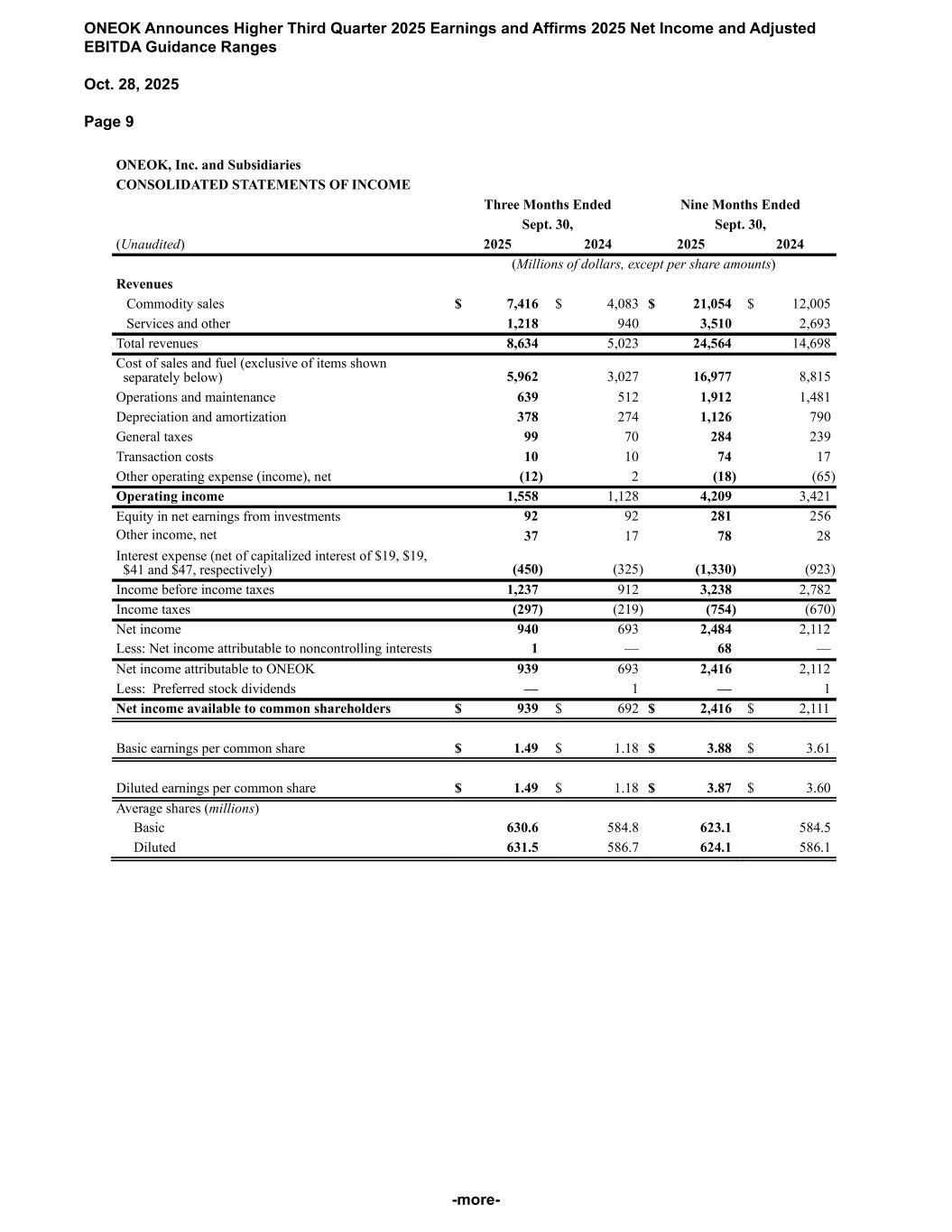 ONEOK Announces Higher Third Quarter 2025 Earnings and Affirms 2025 Net Income and Adjusted EBITDA Guidance Ranges Oct. 28, 2025 Page 9 -more- ONEOK, Inc. and Subsidiaries CONSOLIDATED STATEMENTS OF INCOME Three Months Ended Nine Months Ended Sept. 30, Sept. 30, (Unaudited) 2025 2024 2025 2024 (Millions of dollars, except per share amounts) Revenues Commodity sales $ 7,416 $ 4,083 $ 21,054 $ 12,005 Services and other 1,218 940 3,510 2,693 Total revenues 8,634 5,023 24,564 14,698 Cost of sales and fuel (exclusive of items shown separately below) 5,962 3,027 16,977 8,815 Operations and maintenance 639 512 1,912 1,481 Depreciation and amortization 378 274 1,126 790 General taxes 99 70 284 239 Transaction costs 10 10 74 17 Other operating expense (income), net (12) 2 (18) (65) Operating income 1,558 1,128 4,209 3,421 Equity in net earnings from investments 92 92 281 256 Other income, net 37 17 78 28 Interest expense (net of capitalized interest of $19, $19, $41 and $47, respectively) (450) (325) (1,330) (923) Income before income taxes 1,237 912 3,238 2,782 Income taxes (297) (219) (754) (670) Net income 940 693 2,484 2,112 Less: Net income attributable to noncontrolling interests 1 — 68 — Net income attributable to ONEOK 939 693 2,416 2,112 Less: Preferred stock dividends — 1 — 1 Net income available to common shareholders $ 939 $ 692 $ 2,416 $ 2,111 Basic earnings per common share $ 1.49 $ 1.18 $ 3.88 $ 3.61 Diluted earnings per common share $ 1.49 $ 1.18 $ 3.87 $ 3.60 Average shares (millions) Basic 630.6 584.8 623.1 584.5 Diluted 631.5 586.7 624.1 586.1