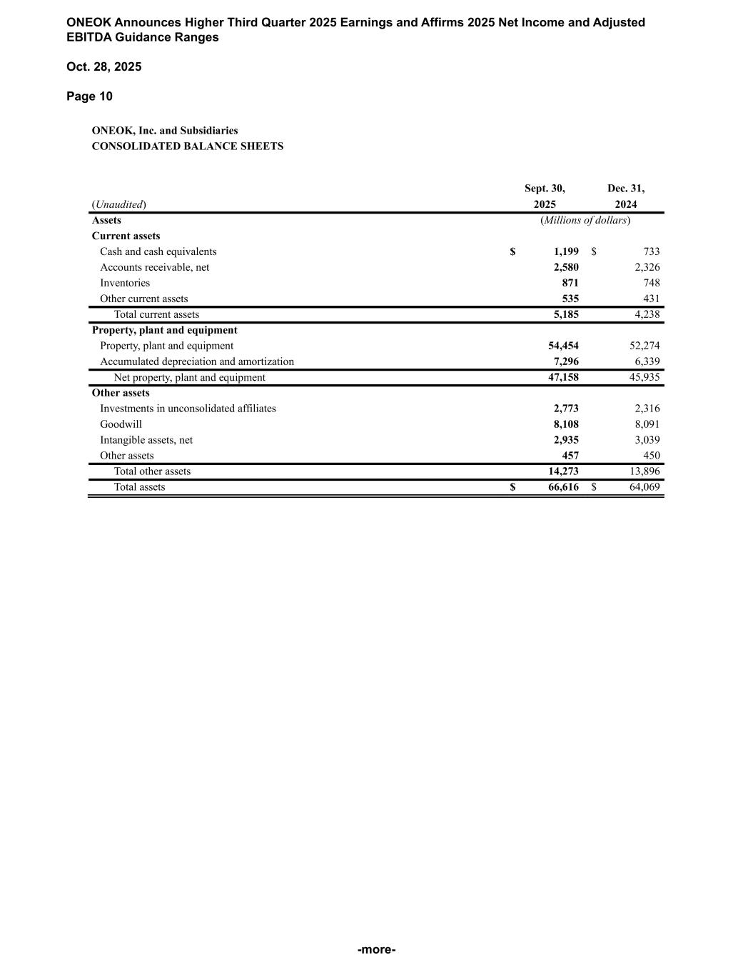ONEOK Announces Higher Third Quarter 2025 Earnings and Affirms 2025 Net Income and Adjusted EBITDA Guidance Ranges Oct. 28, 2025 Page 10 -more- ONEOK, Inc. and Subsidiaries CONSOLIDATED BALANCE SHEETS Sept. 30, Dec. 31, (Unaudited) 2025 2024 Assets (Millions of dollars) Current assets Cash and cash equivalents $ 1,199 $ 733 Accounts receivable, net 2,580 2,326 Inventories 871 748 Other current assets 535 431 Total current assets 5,185 4,238 Property, plant and equipment Property, plant and equipment 54,454 52,274 Accumulated depreciation and amortization 7,296 6,339 Net property, plant and equipment 47,158 45,935 Other assets Investments in unconsolidated affiliates 2,773 2,316 Goodwill 8,108 8,091 Intangible assets, net 2,935 3,039 Other assets 457 450 Total other assets 14,273 13,896 Total assets $ 66,616 $ 64,069