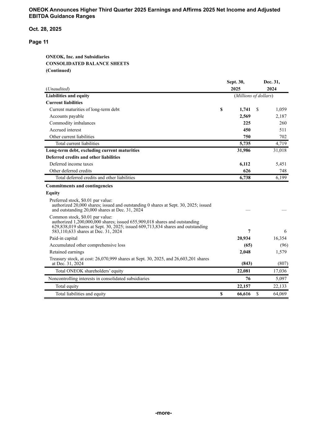 ONEOK Announces Higher Third Quarter 2025 Earnings and Affirms 2025 Net Income and Adjusted EBITDA Guidance Ranges Oct. 28, 2025 Page 11 -more- ONEOK, Inc. and Subsidiaries CONSOLIDATED BALANCE SHEETS (Continued) Sept. 30, Dec. 31, (Unaudited) 2025 2024 Liabilities and equity (Millions of dollars) Current liabilities Current maturities of long-term debt $ 1,741 $ 1,059 Accounts payable 2,569 2,187 Commodity imbalances 225 260 Accrued interest 450 511 Other current liabilities 750 702 Total current liabilities 5,735 4,719 Long-term debt, excluding current maturities 31,986 31,018 Deferred credits and other liabilities Deferred income taxes 6,112 5,451 Other deferred credits 626 748 Total deferred credits and other liabilities 6,738 6,199 Commitments and contingencies Equity Preferred stock, $0.01 par value: authorized 20,000 shares; issued and outstanding 0 shares at Sept. 30, 2025; issued and outstanding 20,000 shares at Dec. 31, 2024 — — Common stock, $0.01 par value: authorized 1,200,000,000 shares; issued 655,909,018 shares and outstanding 629,838,019 shares at Sept. 30, 2025; issued 609,713,834 shares and outstanding 583,110,633 shares at Dec. 31, 2024 7 6 Paid-in capital 20,934 16,354 Accumulated other comprehensive loss (65) (96) Retained earnings 2,048 1,579 Treasury stock, at cost: 26,070,999 shares at Sept. 30, 2025, and 26,603,201 shares at Dec. 31, 2024 (843) (807) Total ONEOK shareholders’ equity 22,081 17,036 Noncontrolling interests in consolidated subsidiaries 76 5,097 Total equity 22,157 22,133 Total liabilities and equity $ 66,616 $ 64,069