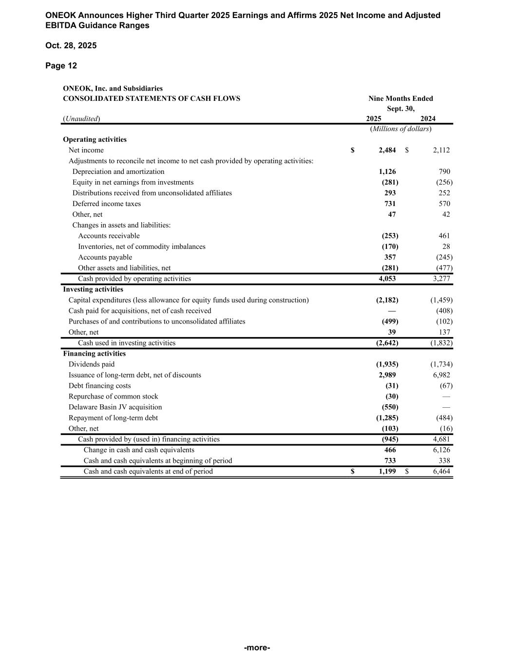 ONEOK Announces Higher Third Quarter 2025 Earnings and Affirms 2025 Net Income and Adjusted EBITDA Guidance Ranges Oct. 28, 2025 Page 12 -more- ONEOK, Inc. and Subsidiaries CONSOLIDATED STATEMENTS OF CASH FLOWS Nine Months Ended Sept. 30, (Unaudited) 2025 2024 (Millions of dollars) Operating activities Net income $ 2,484 $ 2,112 Adjustments to reconcile net income to net cash provided by operating activities: Depreciation and amortization 1,126 790 Equity in net earnings from investments (281) (256) Distributions received from unconsolidated affiliates 293 252 Deferred income taxes 731 570 Other, net 47 42 Changes in assets and liabilities: Accounts receivable (253) 461 Inventories, net of commodity imbalances (170) 28 Accounts payable 357 (245) Other assets and liabilities, net (281) (477) Cash provided by operating activities 4,053 3,277 Investing activities Capital expenditures (less allowance for equity funds used during construction) (2,182) (1,459) Cash paid for acquisitions, net of cash received — (408) Purchases of and contributions to unconsolidated affiliates (499) (102) Other, net 39 137 Cash used in investing activities (2,642) (1,832) Financing activities Dividends paid (1,935) (1,734) Issuance of long-term debt, net of discounts 2,989 6,982 Debt financing costs (31) (67) Repurchase of common stock (30) — Delaware Basin JV acquisition (550) — Repayment of long-term debt (1,285) (484) Other, net (103) (16) Cash provided by (used in) financing activities (945) 4,681 Change in cash and cash equivalents 466 6,126 Cash and cash equivalents at beginning of period 733 338 Cash and cash equivalents at end of period $ 1,199 $ 6,464