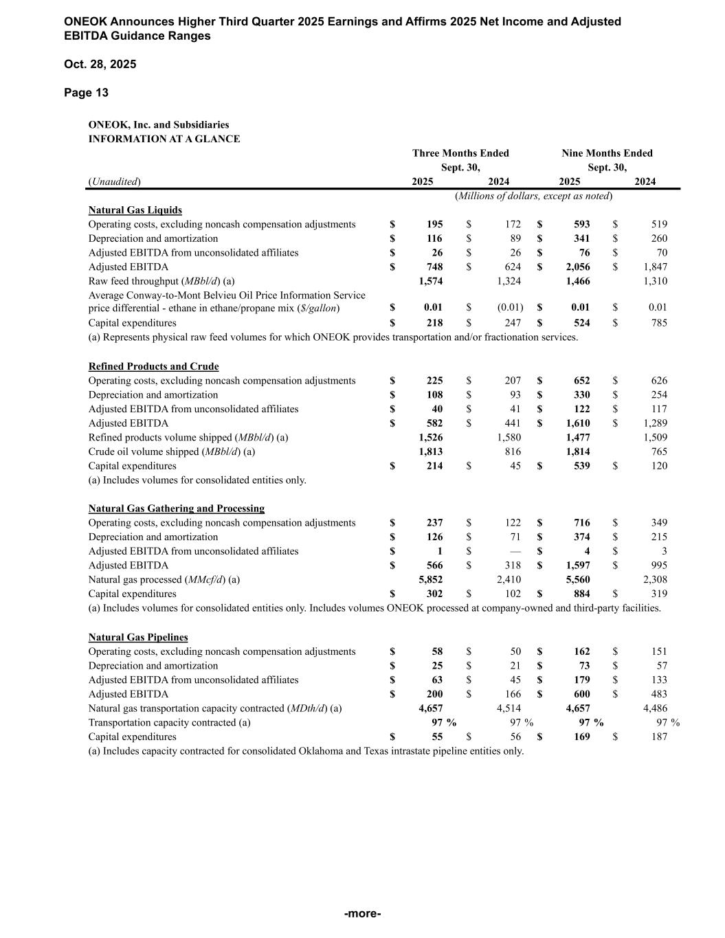 ONEOK Announces Higher Third Quarter 2025 Earnings and Affirms 2025 Net Income and Adjusted EBITDA Guidance Ranges Oct. 28, 2025 Page 13 -more- ONEOK, Inc. and Subsidiaries INFORMATION AT A GLANCE Three Months Ended Nine Months Ended Sept. 30, Sept. 30, (Unaudited) 2025 2024 2025 2024 (Millions of dollars, except as noted) Natural Gas Liquids Operating costs, excluding noncash compensation adjustments $ 195 $ 172 $ 593 $ 519 Depreciation and amortization $ 116 $ 89 $ 341 $ 260 Adjusted EBITDA from unconsolidated affiliates $ 26 $ 26 $ 76 $ 70 Adjusted EBITDA $ 748 $ 624 $ 2,056 $ 1,847 Raw feed throughput (MBbl/d) (a) 1,574 1,324 1,466 1,310 Average Conway-to-Mont Belvieu Oil Price Information Service price differential - ethane in ethane/propane mix ($/gallon) $ 0.01 $ (0.01) $ 0.01 $ 0.01 Capital expenditures $ 218 $ 247 $ 524 $ 785 (a) Represents physical raw feed volumes for which ONEOK provides transportation and/or fractionation services. Refined Products and Crude Operating costs, excluding noncash compensation adjustments $ 225 $ 207 $ 652 $ 626 Depreciation and amortization $ 108 $ 93 $ 330 $ 254 Adjusted EBITDA from unconsolidated affiliates $ 40 $ 41 $ 122 $ 117 Adjusted EBITDA $ 582 $ 441 $ 1,610 $ 1,289 Refined products volume shipped (MBbl/d) (a) 1,526 1,580 1,477 1,509 Crude oil volume shipped (MBbl/d) (a) 1,813 816 1,814 765 Capital expenditures $ 214 $ 45 $ 539 $ 120 (a) Includes volumes for consolidated entities only. Natural Gas Gathering and Processing Operating costs, excluding noncash compensation adjustments $ 237 $ 122 $ 716 $ 349 Depreciation and amortization $ 126 $ 71 $ 374 $ 215 Adjusted EBITDA from unconsolidated affiliates $ 1 $ — $ 4 $ 3 Adjusted EBITDA $ 566 $ 318 $ 1,597 $ 995 Natural gas processed (MMcf/d) (a) 5,852 2,410 5,560 2,308 Capital expenditures $ 302 $ 102 $ 884 $ 319 (a) Includes volumes for consolidated entities only. Includes volumes ONEOK processed at company-owned and third-party facilities. Natural Gas Pipelines Operating costs, excluding noncash compensation adjustments $ 58 $ 50 $ 162 $ 151 Depreciation and amortization $ 25 $ 21 $ 73 $ 57 Adjusted EBITDA from unconsolidated affiliates $ 63 $ 45 $ 179 $ 133 Adjusted EBITDA $ 200 $ 166 $ 600 $ 483 Natural gas transportation capacity contracted (MDth/d) (a) 4,657 4,514 4,657 4,486 Transportation capacity contracted (a) 97 % 97 % 97 % 97 % Capital expenditures $ 55 $ 56 $ 169 $ 187 (a) Includes capacity contracted for consolidated Oklahoma and Texas intrastate pipeline entities only.