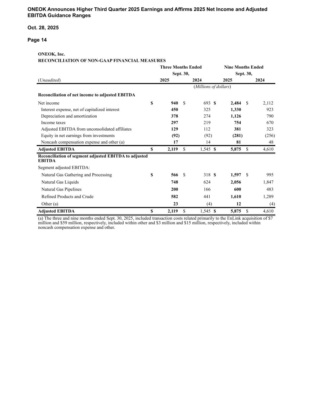ONEOK Announces Higher Third Quarter 2025 Earnings and Affirms 2025 Net Income and Adjusted EBITDA Guidance Ranges Oct. 28, 2025 Page 14 -more- ONEOK, Inc. RECONCILIATION OF NON-GAAP FINANCIAL MEASURES Three Months Ended Nine Months Ended Sept. 30, Sept. 30, (Unaudited) 2025 2024 2025 2024 (Millions of dollars) Reconciliation of net income to adjusted EBITDA Net income $ 940 $ 693 $ 2,484 $ 2,112 Interest expense, net of capitalized interest 450 325 1,330 923 Depreciation and amortization 378 274 1,126 790 Income taxes 297 219 754 670 Adjusted EBITDA from unconsolidated affiliates 129 112 381 323 Equity in net earnings from investments (92) (92) (281) (256) Noncash compensation expense and other (a) 17 14 81 48 Adjusted EBITDA $ 2,119 $ 1,545 $ 5,875 $ 4,610 Reconciliation of segment adjusted EBITDA to adjusted EBITDA Segment adjusted EBITDA: Natural Gas Gathering and Processing $ 566 $ 318 $ 1,597 $ 995 Natural Gas Liquids 748 624 2,056 1,847 Natural Gas Pipelines 200 166 600 483 Refined Products and Crude 582 441 1,610 1,289 Other (a) 23 (4) 12 (4) Adjusted EBITDA $ 2,119 $ 1,545 $ 5,875 $ 4,610 (a) The three and nine months ended Sept. 30, 2025, included transaction costs related primarily to the EnLink acquisition of $7 million and $59 million, respectively, included within other and $3 million and $15 million, respectively, included within noncash compensation expense and other.