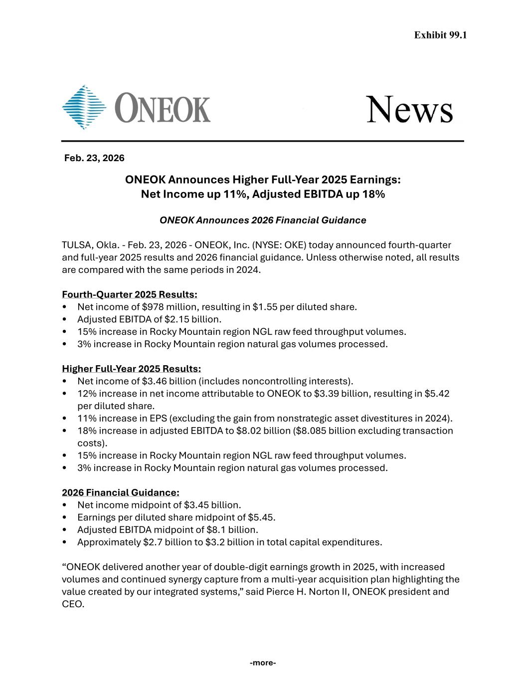 -more- Feb. 23, 2026 ONEOK Announces Higher Full-Year 2025 Earnings: Net Income up 11%, Adjusted EBITDA up 18% ONEOK Announces 2026 Financial Guidance TULSA, Okla. - Feb. 23, 2026 - ONEOK, Inc. (NYSE: OKE) today announced fourth-quarter and full-year 2025 results and 2026 financial guidance. Unless otherwise noted, all results are compared with the same periods in 2024. Fourth-Quarter 2025 Results: • Net income of $978 million, resulting in $1.55 per diluted share. • Adjusted EBITDA of $2.15 billion. • 15% increase in Rocky Mountain region NGL raw feed throughput volumes. • 3% increase in Rocky Mountain region natural gas volumes processed. Higher Full-Year 2025 Results: • Net income of $3.46 billion (includes noncontrolling interests). • 12% increase in net income attributable to ONEOK to $3.39 billion, resulting in $5.42 per diluted share. • 11% increase in EPS (excluding the gain from nonstrategic asset divestitures in 2024). • 18% increase in adjusted EBITDA to $8.02 billion ($8.085 billion excluding transaction costs). • 15% increase in Rocky Mountain region NGL raw feed throughput volumes. • 3% increase in Rocky Mountain region natural gas volumes processed. 2026 Financial Guidance: • Net income midpoint of $3.45 billion. • Earnings per diluted share midpoint of $5.45. • Adjusted EBITDA midpoint of $8.1 billion. • Approximately $2.7 billion to $3.2 billion in total capital expenditures. “ONEOK delivered another year of double-digit earnings growth in 2025, with increased volumes and continued synergy capture from a multi-year acquisition plan highlighting the value created by our integrated systems,” said Pierce H. Norton II, ONEOK president and CEO. Exhibit 99.1