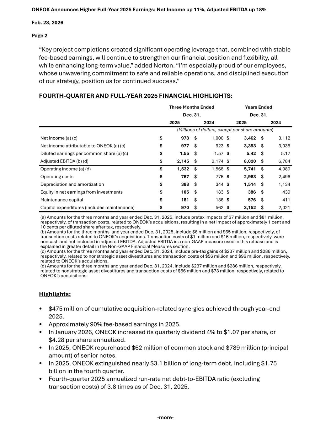 ONEOK Announces Higher Full-Year 2025 Earnings: Net Income up 11%, Adjusted EBITDA up 18% Feb. 23, 2026 Page 2 -more- “Key project completions created significant operating leverage that, combined with stable fee‑based earnings, will continue to strengthen our financial position and flexibility, all while enhancing long-term value,” added Norton. “I’m especially proud of our employees, whose unwavering commitment to safe and reliable operations, and disciplined execution of our strategy, position us for continued success.” FOURTH-QUARTER AND FULL-YEAR 2025 FINANCIAL HIGHLIGHTS: Three Months Ended Years Ended Dec. 31, Dec. 31, 2025 2024 2025 2024 (Millions of dollars, except per share amounts) Net income (a) (c) $ 978 $ 1,000 $ 3,462 $ 3,112 Net income attributable to ONEOK (a) (c) $ 977 $ 923 $ 3,393 $ 3,035 Diluted earnings per common share (a) (c) $ 1.55 $ 1.57 $ 5.42 $ 5.17 Adjusted EBITDA (b) (d) $ 2,145 $ 2,174 $ 8,020 $ 6,784 Operating income (a) (d) $ 1,532 $ 1,568 $ 5,741 $ 4,989 Operating costs $ 767 $ 776 $ 2,963 $ 2,496 Depreciation and amortization $ 388 $ 344 $ 1,514 $ 1,134 Equity in net earnings from investments $ 105 $ 183 $ 386 $ 439 Maintenance capital $ 181 $ 136 $ 576 $ 411 Capital expenditures (includes maintenance) $ 970 $ 562 $ 3,152 $ 2,021 (a) Amounts for the three months and year ended Dec. 31, 2025, include pretax impacts of $7 million and $81 million, respectively, of transaction costs, related to ONEOK’s acquisitions, resulting in a net impact of approximately 1 cent and 10 cents per diluted share after tax, respectively. (b) Amounts for the three months and year ended Dec. 31, 2025, include $6 million and $65 million, respectively, of transaction costs related to ONEOK’s acquisitions. Transaction costs of $1 million and $16 million, respectively, were noncash and not included in adjusted EBITDA. Adjusted EBITDA is a non-GAAP measure used in this release and is explained in greater detail in the Non-GAAP Financial Measures section. (c) Amounts for the three months and year ended Dec. 31, 2024, include pre-tax gains of $237 million and $286 million, respectively, related to nonstrategic asset divestitures and transaction costs of $56 million and $96 million, respectively, related to ONEOK’s acquisitions. (d) Amounts for the three months and year ended Dec. 31, 2024, include $237 million and $286 million, respectively, related to nonstrategic asset divestitures and transaction costs of $56 million and $73 million, respectively, related to ONEOK’s acquisitions. Highlights: • $475 million of cumulative acquisition-related synergies achieved through year-end 2025. • Approximately 90% fee-based earnings in 2025. • In January 2026, ONEOK increased its quarterly dividend 4% to $1.07 per share, or $4.28 per share annualized. • In 2025, ONEOK repurchased $62 million of common stock and $789 million (principal amount) of senior notes. • In 2025, ONEOK extinguished nearly $3.1 billion of long-term debt, including $1.75 billion in the fourth quarter. • Fourth-quarter 2025 annualized run-rate net debt-to-EBITDA ratio (excluding transaction costs) of 3.8 times as of Dec. 31, 2025.