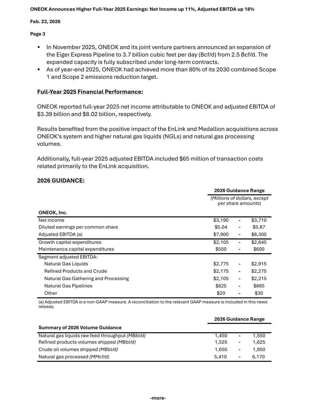 ONEOK Announces Higher Full-Year 2025 Earnings: Net Income up 11%, Adjusted EBITDA up 18% Feb. 23, 2026 Page 3 -more- • In November 2025, ONEOK and its joint venture partners announced an expansion of the Eiger Express Pipeline to 3.7 billion cubic feet per day (Bcf/d) from 2.5 Bcf/d. The expanded capacity is fully subscribed under long-term contracts. • As of year-end 2025, ONEOK had achieved more than 80% of its 2030 combined Scope 1 and Scope 2 emissions reduction target. Full-Year 2025 Financial Performance: ONEOK reported full-year 2025 net income attributable to ONEOK and adjusted EBITDA of $3.39 billion and $8.02 billion, respectively. Results benefited from the positive impact of the EnLink and Medallion acquisitions across ONEOK’s system and higher natural gas liquids (NGLs) and natural gas processing volumes. Additionally, full-year 2025 adjusted EBITDA included $65 million of transaction costs related primarily to the EnLink acquisition. 2026 GUIDANCE: 2026 Guidance Range (Millions of dollars, except per share amounts) ONEOK, Inc. Net income $3,190 - $3,710 Diluted earnings per common share $5.04 - $5.87 Adjusted EBITDA (a) $7,900 - $8,300 Growth capital expenditures $2,105 - $2,645 Maintenance capital expenditures $550 - $600 Segment adjusted EBITDA: Natural Gas Liquids $2,775 - $2,915 Refined Products and Crude $2,175 - $2,275 Natural Gas Gathering and Processing $2,105 - $2,215 Natural Gas Pipelines $825 - $865 Other $20 - $30 (a) Adjusted EBITDA is a non-GAAP measure. A reconciliation to the relevant GAAP measure is included in this news release. 2026 Guidance Range Summary of 2026 Volume Guidance Natural gas liquids raw feed throughput (MBbl/d) 1,450 - 1,550 Refined products volumes shipped (MBbl/d) 1,525 - 1,625 Crude oil volumes shipped (MBbl/d) 1,650 - 1,950 Natural gas processed (MMcf/d) 5,410 - 6,170