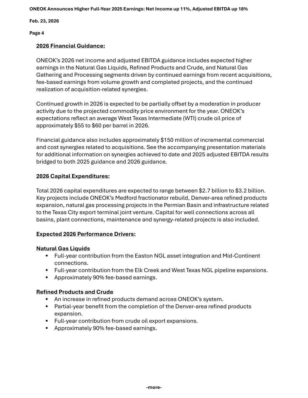 ONEOK Announces Higher Full-Year 2025 Earnings: Net Income up 11%, Adjusted EBITDA up 18% Feb. 23, 2026 Page 4 -more- 2026 Financial Guidance: ONEOK’s 2026 net income and adjusted EBITDA guidance includes expected higher earnings in the Natural Gas Liquids, Refined Products and Crude, and Natural Gas Gathering and Processing segments driven by continued earnings from recent acquisitions, fee-based earnings from volume growth and completed projects, and the continued realization of acquisition-related synergies. Continued growth in 2026 is expected to be partially offset by a moderation in producer activity due to the projected commodity price environment for the year. ONEOK’s expectations reflect an average West Texas Intermediate (WTI) crude oil price of approximately $55 to $60 per barrel in 2026. Financial guidance also includes approximately $150 million of incremental commercial and cost synergies related to acquisitions. See the accompanying presentation materials for additional information on synergies achieved to date and 2025 adjusted EBITDA results bridged to both 2025 guidance and 2026 guidance. 2026 Capital Expenditures: Total 2026 capital expenditures are expected to range between $2.7 billion to $3.2 billion. Key projects include ONEOK’s Medford fractionator rebuild, Denver-area refined products expansion, natural gas processing projects in the Permian Basin and infrastructure related to the Texas City export terminal joint venture. Capital for well connections across all basins, plant connections, maintenance and synergy-related projects is also included. Expected 2026 Performance Drivers: Natural Gas Liquids • Full-year contribution from the Easton NGL asset integration and Mid-Continent connections. • Full-year contribution from the Elk Creek and West Texas NGL pipeline expansions. • Approximately 90% fee-based earnings. Refined Products and Crude • An increase in refined products demand across ONEOK’s system. • Partial-year benefit from the completion of the Denver-area refined products expansion. • Full-year contribution from crude oil export expansions. • Approximately 90% fee-based earnings.
