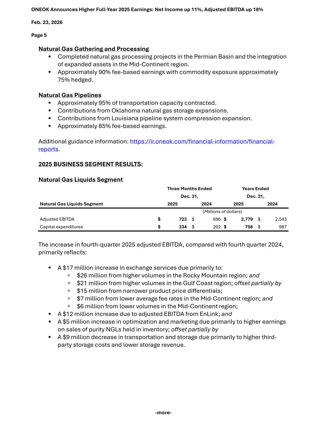 ONEOK Announces Higher Full-Year 2025 Earnings: Net Income up 11%, Adjusted EBITDA up 18% Feb. 23, 2026 Page 5 -more- Natural Gas Gathering and Processing • Completed natural gas processing projects in the Permian Basin and the integration of expanded assets in the Mid-Continent region. • Approximately 90% fee-based earnings with commodity exposure approximately 75% hedged. Natural Gas Pipelines • Approximately 95% of transportation capacity contracted. • Contributions from Oklahoma natural gas storage expansions. • Contributions from Louisiana pipeline system compression expansion. • Approximately 85% fee-based earnings. Additional guidance information: https://ir.oneok.com/financial-information/financial- reports. 2025 BUSINESS SEGMENT RESULTS: Natural Gas Liquids Segment Three Months Ended Years Ended Dec. 31, Dec. 31, Natural Gas Liquids Segment 2025 2024 2025 2024 (Millions of dollars) Adjusted EBITDA $ 723 $ 696 $ 2,779 $ 2,543 Capital expenditures $ 234 $ 202 $ 758 $ 987 The increase in fourth-quarter 2025 adjusted EBITDA, compared with fourth quarter 2024, primarily reflects: • A $17 million increase in exchange services due primarily to: ◦ $26 million from higher volumes in the Rocky Mountain region; and ◦ $21 million from higher volumes in the Gulf Coast region; offset partially by ◦ $15 million from narrower product price differentials; ◦ $7 million from lower average fee rates in the Mid-Continent region; and ◦ $6 million from lower volumes in the Mid-Continent region; • A $12 million increase due to adjusted EBITDA from EnLink; and • A $5 million increase in optimization and marketing due primarily to higher earnings on sales of purity NGLs held in inventory; offset partially by • A $9 million decrease in transportation and storage due primarily to higher third- party storage costs and lower storage revenue.