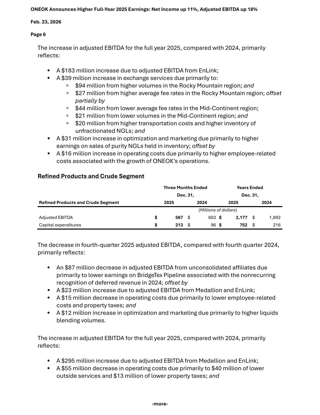 ONEOK Announces Higher Full-Year 2025 Earnings: Net Income up 11%, Adjusted EBITDA up 18% Feb. 23, 2026 Page 6 -more- The increase in adjusted EBITDA for the full year 2025, compared with 2024, primarily reflects: • A $183 million increase due to adjusted EBITDA from EnLink; • A $39 million increase in exchange services due primarily to: ◦ $94 million from higher volumes in the Rocky Mountain region; and ◦ $27 million from higher average fee rates in the Rocky Mountain region; offset partially by ◦ $44 million from lower average fee rates in the Mid-Continent region; ◦ $21 million from lower volumes in the Mid-Continent region; and ◦ $20 million from higher transportation costs and higher inventory of unfractionated NGLs; and • A $31 million increase in optimization and marketing due primarily to higher earnings on sales of purity NGLs held in inventory; offset by • A $16 million increase in operating costs due primarily to higher employee-related costs associated with the growth of ONEOK’s operations. Refined Products and Crude Segment Three Months Ended Years Ended Dec. 31, Dec. 31, Refined Products and Crude Segment 2025 2024 2025 2024 (Millions of dollars) Adjusted EBITDA $ 567 $ 603 $ 2,177 $ 1,892 Capital expenditures $ 213 $ 96 $ 752 $ 216 The decrease in fourth-quarter 2025 adjusted EBITDA, compared with fourth quarter 2024, primarily reflects: • An $87 million decrease in adjusted EBITDA from unconsolidated affiliates due primarily to lower earnings on BridgeTex Pipeline associated with the nonrecurring recognition of deferred revenue in 2024; offset by • A $23 million increase due to adjusted EBITDA from Medallion and EnLink; • A $15 million decrease in operating costs due primarily to lower employee-related costs and property taxes; and • A $12 million increase in optimization and marketing due primarily to higher liquids blending volumes. The increase in adjusted EBITDA for the full year 2025, compared with 2024, primarily reflects: • A $295 million increase due to adjusted EBITDA from Medallion and EnLink; • A $55 million decrease in operating costs due primarily to $40 million of lower outside services and $13 million of lower property taxes; and