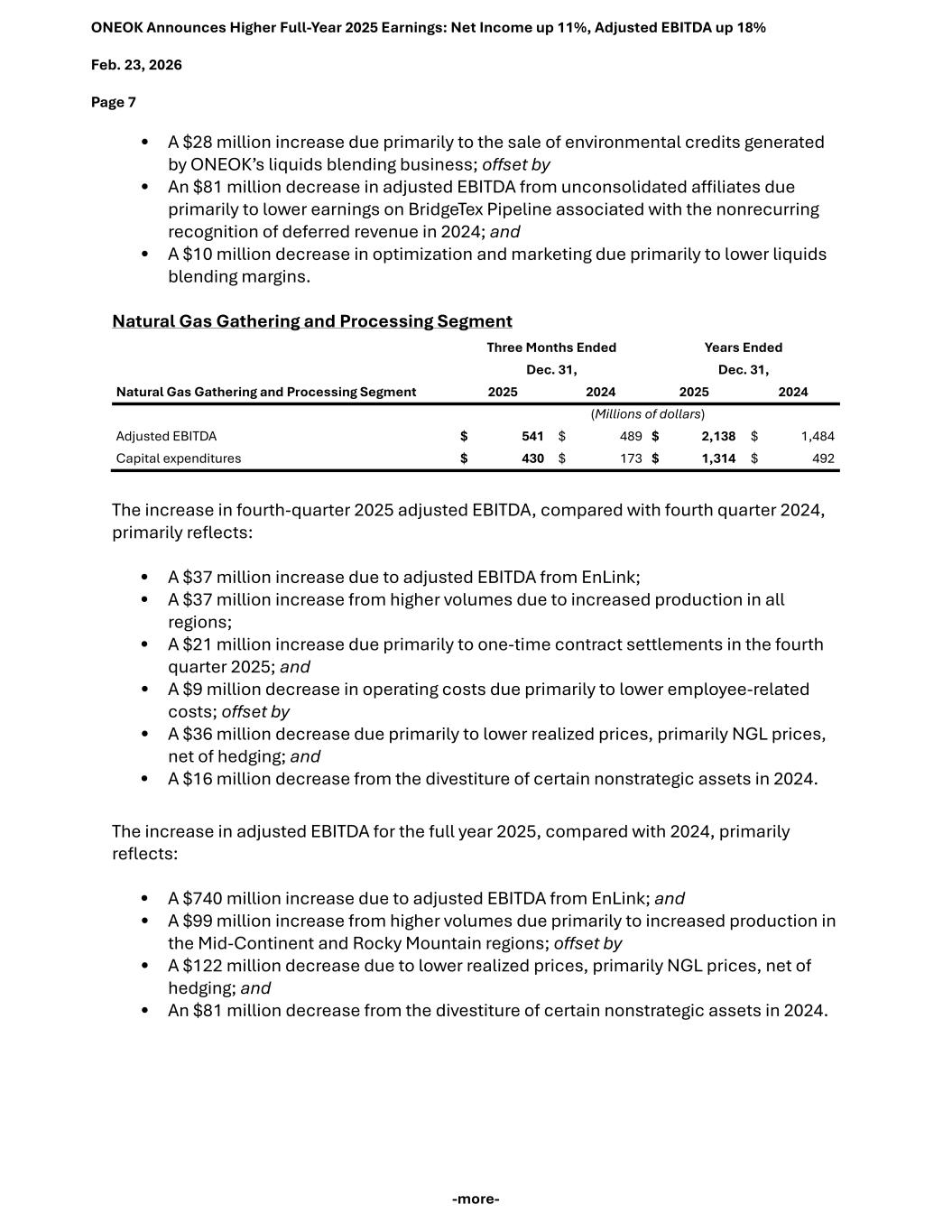 ONEOK Announces Higher Full-Year 2025 Earnings: Net Income up 11%, Adjusted EBITDA up 18% Feb. 23, 2026 Page 7 -more- • A $28 million increase due primarily to the sale of environmental credits generated by ONEOK’s liquids blending business; offset by • An $81 million decrease in adjusted EBITDA from unconsolidated affiliates due primarily to lower earnings on BridgeTex Pipeline associated with the nonrecurring recognition of deferred revenue in 2024; and • A $10 million decrease in optimization and marketing due primarily to lower liquids blending margins. Natural Gas Gathering and Processing Segment Three Months Ended Years Ended Dec. 31, Dec. 31, Natural Gas Gathering and Processing Segment 2025 2024 2025 2024 (Millions of dollars) Adjusted EBITDA $ 541 $ 489 $ 2,138 $ 1,484 Capital expenditures $ 430 $ 173 $ 1,314 $ 492 The increase in fourth-quarter 2025 adjusted EBITDA, compared with fourth quarter 2024, primarily reflects: • A $37 million increase due to adjusted EBITDA from EnLink; • A $37 million increase from higher volumes due to increased production in all regions; • A $21 million increase due primarily to one-time contract settlements in the fourth quarter 2025; and • A $9 million decrease in operating costs due primarily to lower employee-related costs; offset by • A $36 million decrease due primarily to lower realized prices, primarily NGL prices, net of hedging; and • A $16 million decrease from the divestiture of certain nonstrategic assets in 2024. The increase in adjusted EBITDA for the full year 2025, compared with 2024, primarily reflects: • A $740 million increase due to adjusted EBITDA from EnLink; and • A $99 million increase from higher volumes due primarily to increased production in the Mid-Continent and Rocky Mountain regions; offset by • A $122 million decrease due to lower realized prices, primarily NGL prices, net of hedging; and • An $81 million decrease from the divestiture of certain nonstrategic assets in 2024.