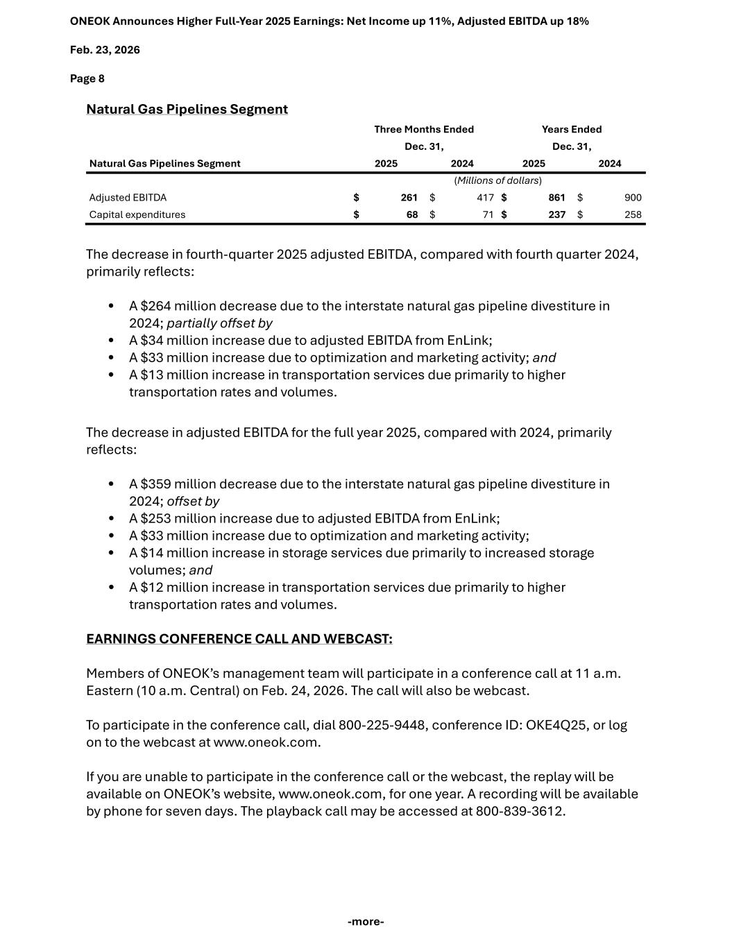 ONEOK Announces Higher Full-Year 2025 Earnings: Net Income up 11%, Adjusted EBITDA up 18% Feb. 23, 2026 Page 8 -more- Natural Gas Pipelines Segment Three Months Ended Years Ended Dec. 31, Dec. 31, Natural Gas Pipelines Segment 2025 2024 2025 2024 (Millions of dollars) Adjusted EBITDA $ 261 $ 417 $ 861 $ 900 Capital expenditures $ 68 $ 71 $ 237 $ 258 The decrease in fourth-quarter 2025 adjusted EBITDA, compared with fourth quarter 2024, primarily reflects: • A $264 million decrease due to the interstate natural gas pipeline divestiture in 2024; partially offset by • A $34 million increase due to adjusted EBITDA from EnLink; • A $33 million increase due to optimization and marketing activity; and • A $13 million increase in transportation services due primarily to higher transportation rates and volumes. The decrease in adjusted EBITDA for the full year 2025, compared with 2024, primarily reflects: • A $359 million decrease due to the interstate natural gas pipeline divestiture in 2024; offset by • A $253 million increase due to adjusted EBITDA from EnLink; • A $33 million increase due to optimization and marketing activity; • A $14 million increase in storage services due primarily to increased storage volumes; and • A $12 million increase in transportation services due primarily to higher transportation rates and volumes. EARNINGS CONFERENCE CALL AND WEBCAST: Members of ONEOK’s management team will participate in a conference call at 11 a.m. Eastern (10 a.m. Central) on Feb. 24, 2026. The call will also be webcast. To participate in the conference call, dial 800-225-9448, conference ID: OKE4Q25, or log on to the webcast at www.oneok.com. If you are unable to participate in the conference call or the webcast, the replay will be available on ONEOK’s website, www.oneok.com, for one year. A recording will be available by phone for seven days. The playback call may be accessed at 800-839-3612.