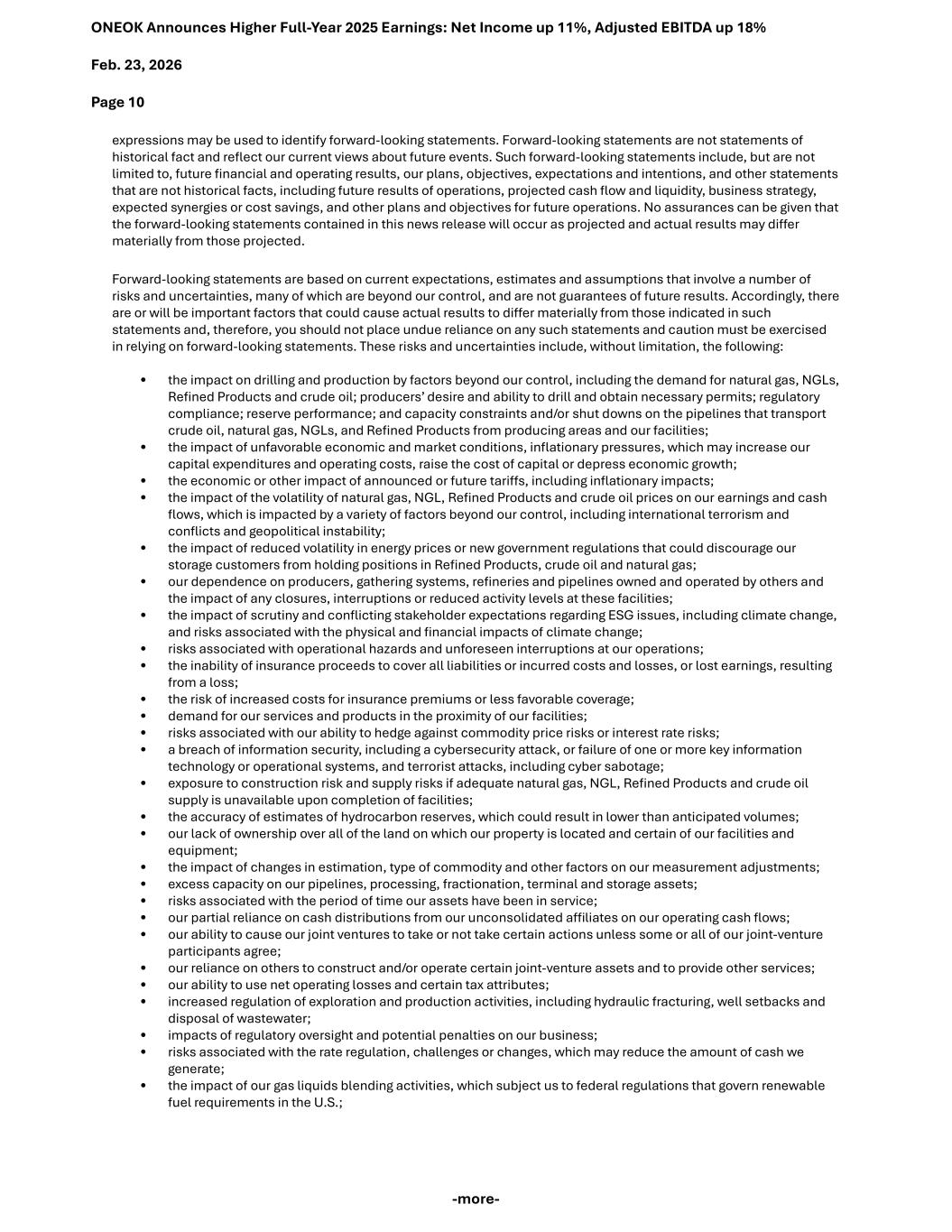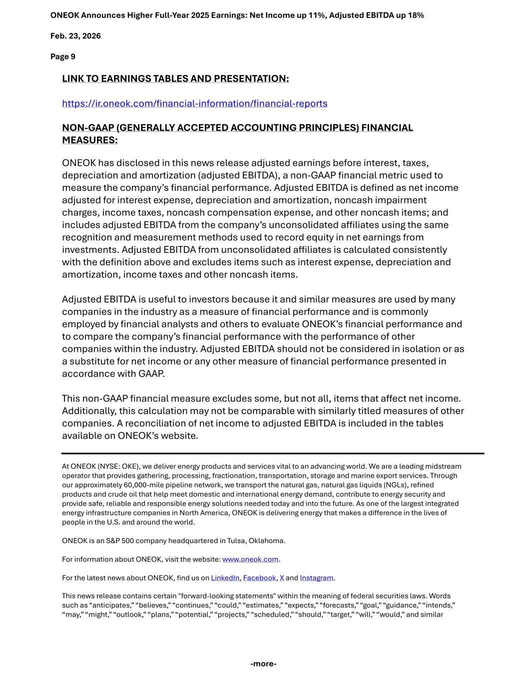 ONEOK Announces Higher Full-Year 2025 Earnings: Net Income up 11%, Adjusted EBITDA up 18% Feb. 23, 2026 Page 9 -more- LINK TO EARNINGS TABLES AND PRESENTATION: https://ir.oneok.com/financial-information/financial-reports NON-GAAP (GENERALLY ACCEPTED ACCOUNTING PRINCIPLES) FINANCIAL MEASURES: ONEOK has disclosed in this news release adjusted earnings before interest, taxes, depreciation and amortization (adjusted EBITDA), a non-GAAP financial metric used to measure the company’s financial performance. Adjusted EBITDA is defined as net income adjusted for interest expense, depreciation and amortization, noncash impairment charges, income taxes, noncash compensation expense, and other noncash items; and includes adjusted EBITDA from the company’s unconsolidated affiliates using the same recognition and measurement methods used to record equity in net earnings from investments. Adjusted EBITDA from unconsolidated affiliates is calculated consistently with the definition above and excludes items such as interest expense, depreciation and amortization, income taxes and other noncash items. Adjusted EBITDA is useful to investors because it and similar measures are used by many companies in the industry as a measure of financial performance and is commonly employed by financial analysts and others to evaluate ONEOK’s financial performance and to compare the company’s financial performance with the performance of other companies within the industry. Adjusted EBITDA should not be considered in isolation or as a substitute for net income or any other measure of financial performance presented in accordance with GAAP. This non-GAAP financial measure excludes some, but not all, items that affect net income. Additionally, this calculation may not be comparable with similarly titled measures of other companies. A reconciliation of net income to adjusted EBITDA is included in the tables available on ONEOK’s website. At ONEOK (NYSE: OKE), we deliver energy products and services vital to an advancing world. We are a leading midstream operator that provides gathering, processing, fractionation, transportation, storage and marine export services. Through our approximately 60,000-mile pipeline network, we transport the natural gas, natural gas liquids (NGLs), refined products and crude oil that help meet domestic and international energy demand, contribute to energy security and provide safe, reliable and responsible energy solutions needed today and into the future. As one of the largest integrated energy infrastructure companies in North America, ONEOK is delivering energy that makes a difference in the lives of people in the U.S. and around the world. ONEOK is an S&P 500 company headquartered in Tulsa, Oklahoma. For information about ONEOK, visit the website: www.oneok.com. For the latest news about ONEOK, find us on LinkedIn, Facebook, X and Instagram. This news release contains certain "forward-looking statements" within the meaning of federal securities laws. Words such as “anticipates,” “believes,” “continues,” “could,” “estimates,” “expects,” “forecasts,” “goal,” “guidance,” “intends,” “may,” “might,” “outlook,” “plans,” “potential,” “projects,” “scheduled,” “should,” “target,” “will,” “would,” and similar