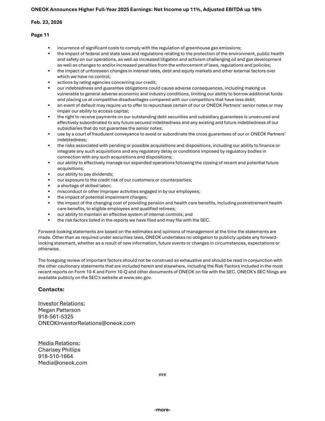 ONEOK Announces Higher Full-Year 2025 Earnings: Net Income up 11%, Adjusted EBITDA up 18% Feb. 23, 2026 Page 11 -more- • incurrence of significant costs to comply with the regulation of greenhouse gas emissions; • the impact of federal and state laws and regulations relating to the protection of the environment, public health and safety on our operations, as well as increased litigation and activism challenging oil and gas development as well as changes to and/or increased penalties from the enforcement of laws, regulations and policies; • the impact of unforeseen changes in interest rates, debt and equity markets and other external factors over which we have no control; • actions by rating agencies concerning our credit; • our indebtedness and guarantee obligations could cause adverse consequences, including making us vulnerable to general adverse economic and industry conditions, limiting our ability to borrow additional funds and placing us at competitive disadvantages compared with our competitors that have less debt; • an event of default may require us to offer to repurchase certain of our or ONEOK Partners’ senior notes or may impair our ability to access capital; • the right to receive payments on our outstanding debt securities and subsidiary guarantees is unsecured and effectively subordinated to any future secured indebtedness and any existing and future indebtedness of our subsidiaries that do not guarantee the senior notes; • use by a court of fraudulent conveyance to avoid or subordinate the cross guarantees of our or ONEOK Partners’ indebtedness; • the risks associated with pending or possible acquisitions and dispositions, including our ability to finance or integrate any such acquisitions and any regulatory delay or conditions imposed by regulatory bodies in connection with any such acquisitions and dispositions; • our ability to effectively manage our expanded operations following the closing of recent and potential future acquisitions; • our ability to pay dividends; • our exposure to the credit risk of our customers or counterparties; • a shortage of skilled labor; • misconduct or other improper activities engaged in by our employees; • the impact of potential impairment charges; • the impact of the changing cost of providing pension and health care benefits, including postretirement health care benefits, to eligible employees and qualified retirees; • our ability to maintain an effective system of internal controls; and • the risk factors listed in the reports we have filed and may file with the SEC. Forward-looking statements are based on the estimates and opinions of management at the time the statements are made. Other than as required under securities laws, ONEOK undertakes no obligation to publicly update any forward- looking statement, whether as a result of new information, future events or changes in circumstances, expectations or otherwise. The foregoing review of important factors should not be construed as exhaustive and should be read in conjunction with the other cautionary statements that are included herein and elsewhere, including the Risk Factors included in the most recent reports on Form 10-K and Form 10-Q and other documents of ONEOK on file with the SEC. ONEOK's SEC filings are available publicly on the SEC's website at www.sec.gov. Contacts: Investor Relations: Megan Patterson 918-561-5325 ONEOKInvestorRelations@oneok.com Media Relations: Charlsey Phillips 918-510-1664 Media@oneok.com ###