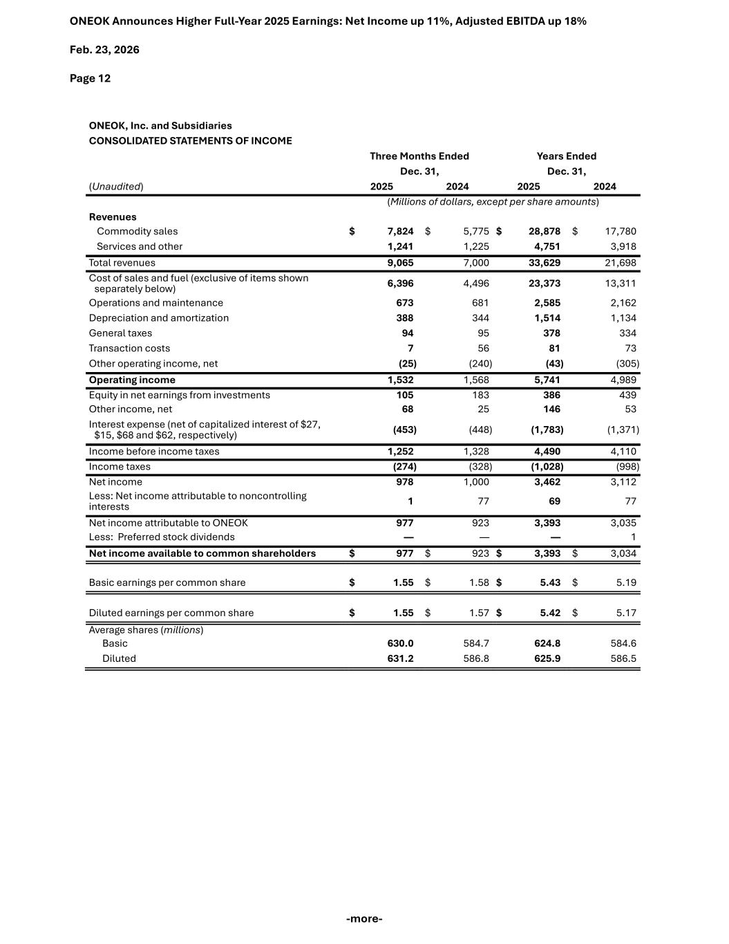ONEOK Announces Higher Full-Year 2025 Earnings: Net Income up 11%, Adjusted EBITDA up 18% Feb. 23, 2026 Page 12 -more- ONEOK, Inc. and Subsidiaries CONSOLIDATED STATEMENTS OF INCOME Three Months Ended Years Ended Dec. 31, Dec. 31, (Unaudited) 2025 2024 2025 2024 (Millions of dollars, except per share amounts) Revenues Commodity sales $ 7,824 $ 5,775 $ 28,878 $ 17,780 Services and other 1,241 1,225 4,751 3,918 Total revenues 9,065 7,000 33,629 21,698 Cost of sales and fuel (exclusive of items shown separately below) 6,396 4,496 23,373 13,311 Operations and maintenance 673 681 2,585 2,162 Depreciation and amortization 388 344 1,514 1,134 General taxes 94 95 378 334 Transaction costs 7 56 81 73 Other operating income, net (25) (240) (43) (305) Operating income 1,532 1,568 5,741 4,989 Equity in net earnings from investments 105 183 386 439 Other income, net 68 25 146 53 Interest expense (net of capitalized interest of $27, $15, $68 and $62, respectively) (453) (448) (1,783) (1,371) Income before income taxes 1,252 1,328 4,490 4,110 Income taxes (274) (328) (1,028) (998) Net income 978 1,000 3,462 3,112 Less: Net income attributable to noncontrolling interests 1 77 69 77 Net income attributable to ONEOK 977 923 3,393 3,035 Less: Preferred stock dividends — — — 1 Net income available to common shareholders $ 977 $ 923 $ 3,393 $ 3,034 Basic earnings per common share $ 1.55 $ 1.58 $ 5.43 $ 5.19 Diluted earnings per common share $ 1.55 $ 1.57 $ 5.42 $ 5.17 Average shares (millions) Basic 630.0 584.7 624.8 584.6 Diluted 631.2 586.8 625.9 586.5