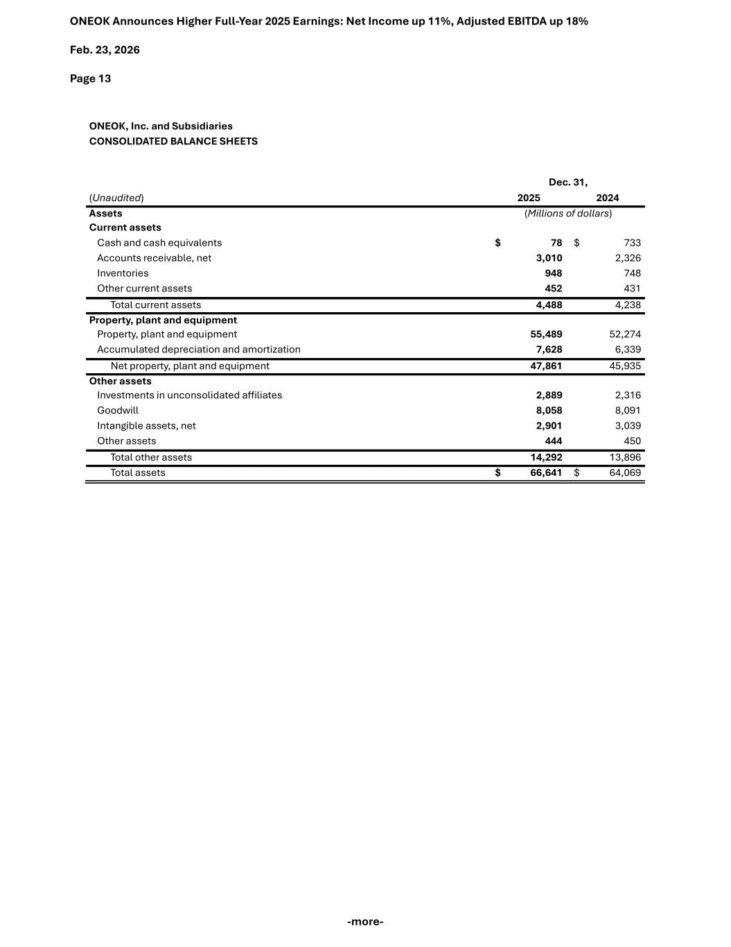 ONEOK Announces Higher Full-Year 2025 Earnings: Net Income up 11%, Adjusted EBITDA up 18% Feb. 23, 2026 Page 13 -more- ONEOK, Inc. and Subsidiaries CONSOLIDATED BALANCE SHEETS Dec. 31, (Unaudited) 2025 2024 Assets (Millions of dollars) Current assets Cash and cash equivalents $ 78 $ 733 Accounts receivable, net 3,010 2,326 Inventories 948 748 Other current assets 452 431 Total current assets 4,488 4,238 Property, plant and equipment Property, plant and equipment 55,489 52,274 Accumulated depreciation and amortization 7,628 6,339 Net property, plant and equipment 47,861 45,935 Other assets Investments in unconsolidated affiliates 2,889 2,316 Goodwill 8,058 8,091 Intangible assets, net 2,901 3,039 Other assets 444 450 Total other assets 14,292 13,896 Total assets $ 66,641 $ 64,069