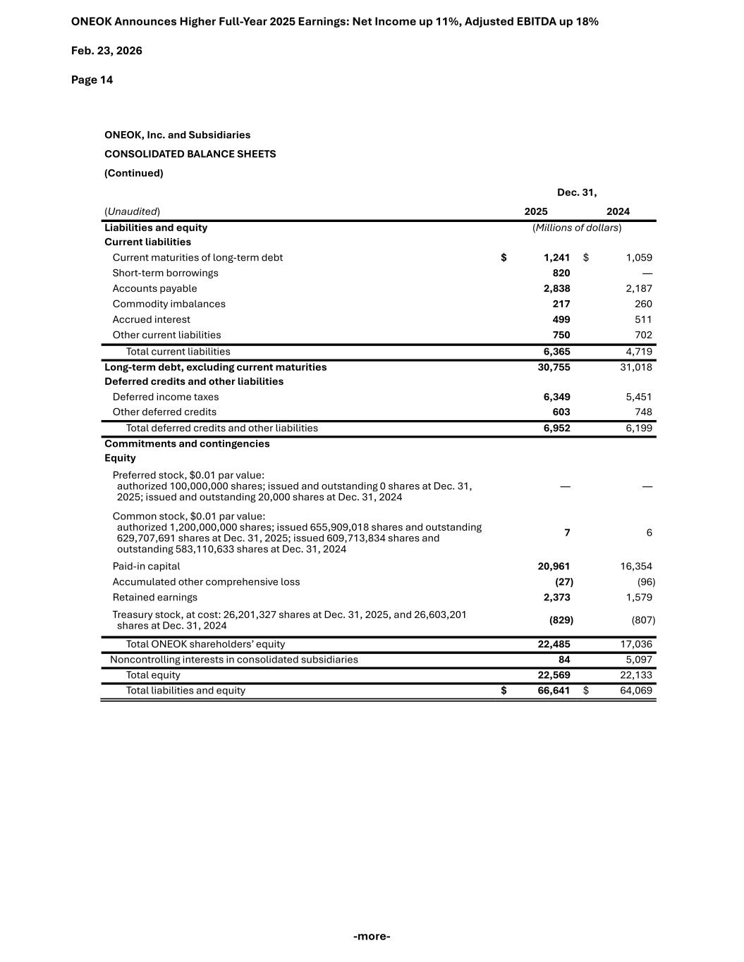 ONEOK Announces Higher Full-Year 2025 Earnings: Net Income up 11%, Adjusted EBITDA up 18% Feb. 23, 2026 Page 14 -more- ONEOK, Inc. and Subsidiaries CONSOLIDATED BALANCE SHEETS (Continued) Dec. 31, (Unaudited) 2025 2024 Liabilities and equity (Millions of dollars) Current liabilities Current maturities of long-term debt $ 1,241 $ 1,059 Short-term borrowings 820 — Accounts payable 2,838 2,187 Commodity imbalances 217 260 Accrued interest 499 511 Other current liabilities 750 702 Total current liabilities 6,365 4,719 Long-term debt, excluding current maturities 30,755 31,018 Deferred credits and other liabilities Deferred income taxes 6,349 5,451 Other deferred credits 603 748 Total deferred credits and other liabilities 6,952 6,199 Commitments and contingencies Equity Preferred stock, $0.01 par value: authorized 100,000,000 shares; issued and outstanding 0 shares at Dec. 31, 2025; issued and outstanding 20,000 shares at Dec. 31, 2024 — — Common stock, $0.01 par value: authorized 1,200,000,000 shares; issued 655,909,018 shares and outstanding 629,707,691 shares at Dec. 31, 2025; issued 609,713,834 shares and outstanding 583,110,633 shares at Dec. 31, 2024 7 6 Paid-in capital 20,961 16,354 Accumulated other comprehensive loss (27) (96) Retained earnings 2,373 1,579 Treasury stock, at cost: 26,201,327 shares at Dec. 31, 2025, and 26,603,201 shares at Dec. 31, 2024 (829) (807) Total ONEOK shareholders’ equity 22,485 17,036 Noncontrolling interests in consolidated subsidiaries 84 5,097 Total equity 22,569 22,133 Total liabilities and equity $ 66,641 $ 64,069