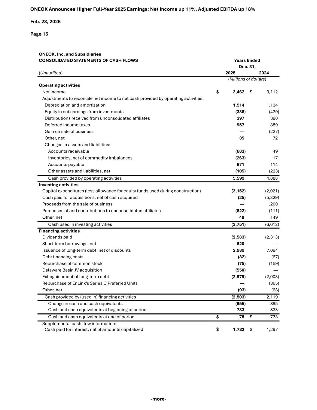 ONEOK Announces Higher Full-Year 2025 Earnings: Net Income up 11%, Adjusted EBITDA up 18% Feb. 23, 2026 Page 15 -more- ONEOK, Inc. and Subsidiaries CONSOLIDATED STATEMENTS OF CASH FLOWS Years Ended Dec. 31, (Unaudited) 2025 2024 (Millions of dollars) Operating activities Net income $ 3,462 $ 3,112 Adjustments to reconcile net income to net cash provided by operating activities: Depreciation and amortization 1,514 1,134 Equity in net earnings from investments (386) (439) Distributions received from unconsolidated affiliates 397 390 Deferred income taxes 957 889 Gain on sale of business — (227) Other, net 35 72 Changes in assets and liabilities: Accounts receivable (683) 49 Inventories, net of commodity imbalances (263) 17 Accounts payable 671 114 Other assets and liabilities, net (105) (223) Cash provided by operating activities 5,599 4,888 Investing activities Capital expenditures (less allowance for equity funds used during construction) (3,152) (2,021) Cash paid for acquisitions, net of cash acquired (25) (5,829) Proceeds from the sale of business — 1,200 Purchases of and contributions to unconsolidated affiliates (622) (111) Other, net 48 149 Cash used in investing activities (3,751) (6,612) Financing activities Dividends paid (2,583) (2,313) Short-term borrowings, net 820 — Issuance of long-term debt, net of discounts 2,989 7,094 Debt financing costs (32) (67) Repurchase of common stock (75) (159) Delaware Basin JV acquisition (550) — Extinguishment of long-term debt (2,979) (2,003) Repurchase of EnLink’s Series C Preferred Units — (365) Other, net (93) (68) Cash provided by (used in) financing activities (2,503) 2,119 Change in cash and cash equivalents (655) 395 Cash and cash equivalents at beginning of period 733 338 Cash and cash equivalents at end of period $ 78 $ 733 Supplemental cash flow information: Cash paid for interest, net of amounts capitalized $ 1,732 $ 1,297