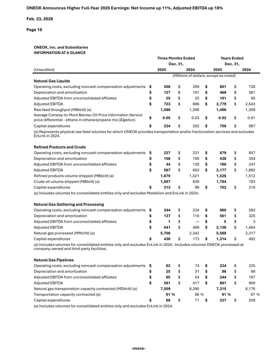 ONEOK Announces Higher Full-Year 2025 Earnings: Net Income up 11%, Adjusted EBITDA up 18% Feb. 23, 2026 Page 16 -more- ONEOK, Inc. and Subsidiaries INFORMATION AT A GLANCE Three Months Ended Years Ended Dec. 31, Dec. 31, (Unaudited) 2025 2024 2025 2024 (Millions of dollars, except as noted) Natural Gas Liquids Operating costs, excluding noncash compensation adjustments $ 208 $ 209 $ 801 $ 728 Depreciation and amortization $ 127 $ 101 $ 468 $ 361 Adjusted EBITDA from unconsolidated affiliates $ 25 $ 25 $ 101 $ 95 Adjusted EBITDA $ 723 $ 696 $ 2,779 $ 2,543 Raw feed throughput (MBbl/d) (a) 1,586 1,306 1,496 1,309 Average Conway-to-Mont Belvieu Oil Price Information Service price differential - ethane in ethane/propane mix ($/gallon) $ 0.05 $ 0.03 $ 0.02 $ 0.01 Capital expenditures $ 234 $ 202 $ 758 $ 987 (a) Represents physical raw feed volumes for which ONEOK provides transportation and/or fractionation services and excludes EnLink in 2024. Refined Products and Crude Operating costs, excluding noncash compensation adjustments $ 227 $ 231 $ 879 $ 857 Depreciation and amortization $ 108 $ 100 $ 438 $ 354 Adjusted EBITDA from unconsolidated affiliates $ 44 $ 130 $ 166 $ 247 Adjusted EBITDA $ 567 $ 603 $ 2,177 $ 1,892 Refined products volume shipped (MBbl/d) (a) 1,670 1,521 1,526 1,512 Crude oil volume shipped (MBbl/d) (a) 1,697 839 1,784 783 Capital expenditures $ 213 $ 96 $ 752 $ 216 (a) Includes volumes for consolidated entities only and excludes Medallion and EnLink in 2024. Natural Gas Gathering and Processing Operating costs, excluding noncash compensation adjustments $ 244 $ 234 $ 960 $ 583 Depreciation and amortization $ 127 $ 110 $ 501 $ 325 Adjusted EBITDA from unconsolidated affiliates $ 1 $ — $ 5 $ 3 Adjusted EBITDA $ 541 $ 489 $ 2,138 $ 1,484 Natural gas processed (MMcf/d) (a) 5,706 2,342 5,588 2,317 Capital expenditures $ 430 $ 173 $ 1,314 $ 492 (a) Includes volumes for consolidated entities only and excludes EnLink in 2024. Includes volumes ONEOK processed at company-owned and third-party facilities. Natural Gas Pipelines Operating costs, excluding noncash compensation adjustments $ 62 $ 74 $ 224 $ 225 Depreciation and amortization $ 25 $ 31 $ 98 $ 88 Adjusted EBITDA from unconsolidated affiliates $ 65 $ 54 $ 244 $ 187 Adjusted EBITDA $ 261 $ 417 $ 861 $ 900 Natural gas transportation capacity contracted (MDth/d) (a) 7,509 8,395 7,315 8,176 Transportation capacity contracted (a) 91 % 98 % 91 % 97 % Capital expenditures $ 68 $ 71 $ 237 $ 258 (a) Includes volumes for consolidated entities only and excludes EnLink in 2024.
