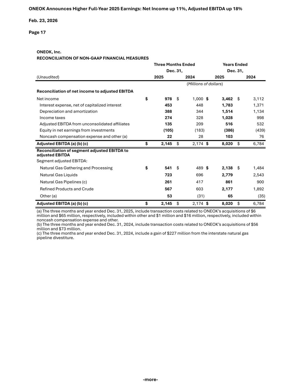 ONEOK Announces Higher Full-Year 2025 Earnings: Net Income up 11%, Adjusted EBITDA up 18% Feb. 23, 2026 Page 17 -more- ONEOK, Inc. RECONCILIATION OF NON-GAAP FINANCIAL MEASURES Three Months Ended Years Ended Dec. 31, Dec. 31, (Unaudited) 2025 2024 2025 2024 (Millions of dollars) Reconciliation of net income to adjusted EBITDA Net income $ 978 $ 1,000 $ 3,462 $ 3,112 Interest expense, net of capitalized interest 453 448 1,783 1,371 Depreciation and amortization 388 344 1,514 1,134 Income taxes 274 328 1,028 998 Adjusted EBITDA from unconsolidated affiliates 135 209 516 532 Equity in net earnings from investments (105) (183) (386) (439) Noncash compensation expense and other (a) 22 28 103 76 Adjusted EBITDA (a) (b) (c) $ 2,145 $ 2,174 $ 8,020 $ 6,784 Reconciliation of segment adjusted EBITDA to adjusted EBITDA Segment adjusted EBITDA: Natural Gas Gathering and Processing $ 541 $ 489 $ 2,138 $ 1,484 Natural Gas Liquids 723 696 2,779 2,543 Natural Gas Pipelines (c) 261 417 861 900 Refined Products and Crude 567 603 2,177 1,892 Other (a) 53 (31) 65 (35) Adjusted EBITDA (a) (b) (c) $ 2,145 $ 2,174 $ 8,020 $ 6,784 (a) The three months and year ended Dec. 31, 2025, include transaction costs related to ONEOK’s acquisitions of $6 million and $65 million, respectively, included within other and $1 million and $16 million, respectively, included within noncash compensation expense and other. (b) The three months and year ended Dec. 31, 2024, include transaction costs related to ONEOK’s acquisitions of $56 million and $73 million. (c) The three months and year ended Dec. 31, 2024, include a gain of $227 million from the interstate natural gas pipeline divestiture.