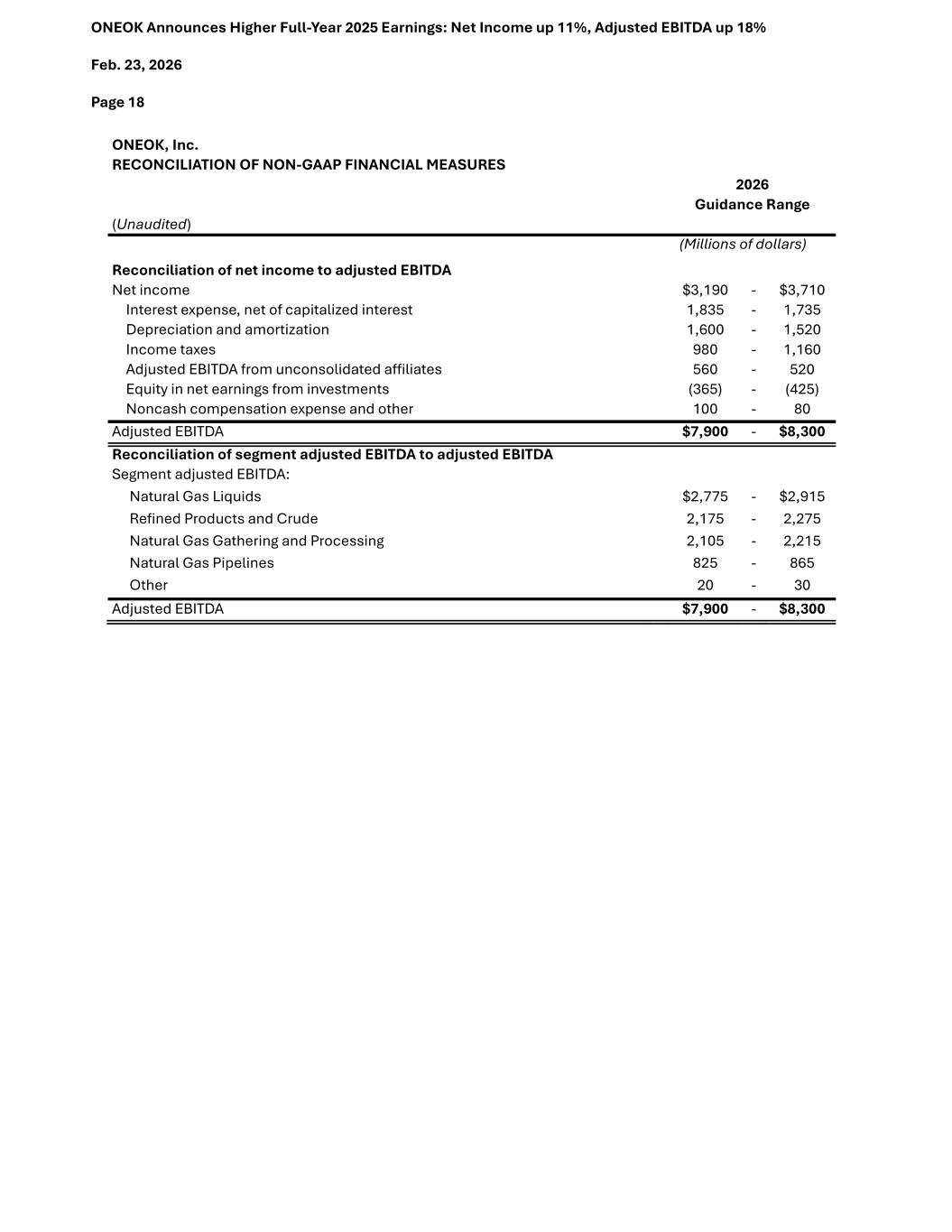 ONEOK Announces Higher Full-Year 2025 Earnings: Net Income up 11%, Adjusted EBITDA up 18% Feb. 23, 2026 Page 18 -more- ONEOK, Inc. RECONCILIATION OF NON-GAAP FINANCIAL MEASURES 2026 Guidance Range (Unaudited) (Millions of dollars) Reconciliation of net income to adjusted EBITDA Net income $3,190 - $3,710 Interest expense, net of capitalized interest 1,835 - 1,735 Depreciation and amortization 1,600 - 1,520 Income taxes 980 - 1,160 Adjusted EBITDA from unconsolidated affiliates 560 - 520 Equity in net earnings from investments (365) - (425) Noncash compensation expense and other 100 - 80 Adjusted EBITDA $7,900 - $8,300 Reconciliation of segment adjusted EBITDA to adjusted EBITDA Segment adjusted EBITDA: Natural Gas Liquids $2,775 - $2,915 Refined Products and Crude 2,175 - 2,275 Natural Gas Gathering and Processing 2,105 - 2,215 Natural Gas Pipelines 825 - 865 Other 20 - 30 Adjusted EBITDA $7,900 - $8,300