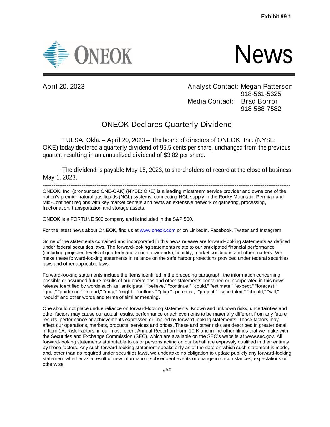 News ONEOK Declares Quarterly Dividend TULSA, Okla. – April 20, 2023 – The board of directors of ONEOK, Inc. (NYSE: OKE) today declared a quarterly dividend of 95.5 cents per share, unchanged from the previous quarter, resulting in an annualized dividend of $3.82 per share. The dividend is payable May 15, 2023, to shareholders of record at the close of business May 1, 2023. ------------------------------------------------------------------------------------------------------------------- ONEOK, Inc. (pronounced ONE-OAK) (NYSE: OKE) is a leading midstream service provider and owns one of the nation's premier natural gas liquids (NGL) systems, connecting NGL supply in the Rocky Mountain, Permian and Mid-Continent regions with key market centers and owns an extensive network of gathering, processing, fractionation, transportation and storage assets. ONEOK is a FORTUNE 500 company and is included in the S&P 500. For the latest news about ONEOK, find us at www.oneok.com or on LinkedIn, Facebook, Twitter and Instagram. Some of the statements contained and incorporated in this news release are forward-looking statements as defined under federal securities laws. The forward-looking statements relate to our anticipated financial performance (including projected levels of quarterly and annual dividends), liquidity, market conditions and other matters. We make these forward-looking statements in reliance on the safe harbor protections provided under federal securities laws and other applicable laws. Forward-looking statements include the items identified in the preceding paragraph, the information concerning possible or assumed future results of our operations and other statements contained or incorporated in this news release identified by words such as "anticipate," "believe," "continue," "could," "estimate," "expect," "forecast," "goal," "guidance," "intend," "may," "might," “outlook,” "plan," "potential," "project," "scheduled," "should," "will," "would" and other words and terms of similar meaning. One should not place undue reliance on forward-looking statements. Known and unknown risks, uncertainties and other factors may cause our actual results, performance or achievements to be materially different from any future results, performance or achievements expressed or implied by forward-looking statements. Those factors may affect our operations, markets, products, services and prices. These and other risks are described in greater detail in Item 1A, Risk Factors, in our most recent Annual Report on Form 10-K and in the other filings that we make with the Securities and Exchange Commission (SEC), which are available on the SEC’s website at www.sec.gov. All forward-looking statements attributable to us or persons acting on our behalf are expressly qualified in their entirety by these factors. Any such forward-looking statement speaks only as of the date on which such statement is made, and, other than as required under securities laws, we undertake no obligation to update publicly any forward-looking statement whether as a result of new information, subsequent events or change in circumstances, expectations or otherwise. ### April 20, 2023 Analyst Contact: Megan Patterson 918-561-5325 Media Contact: Brad Borror 918-588-7582 Exhibit 99.1
