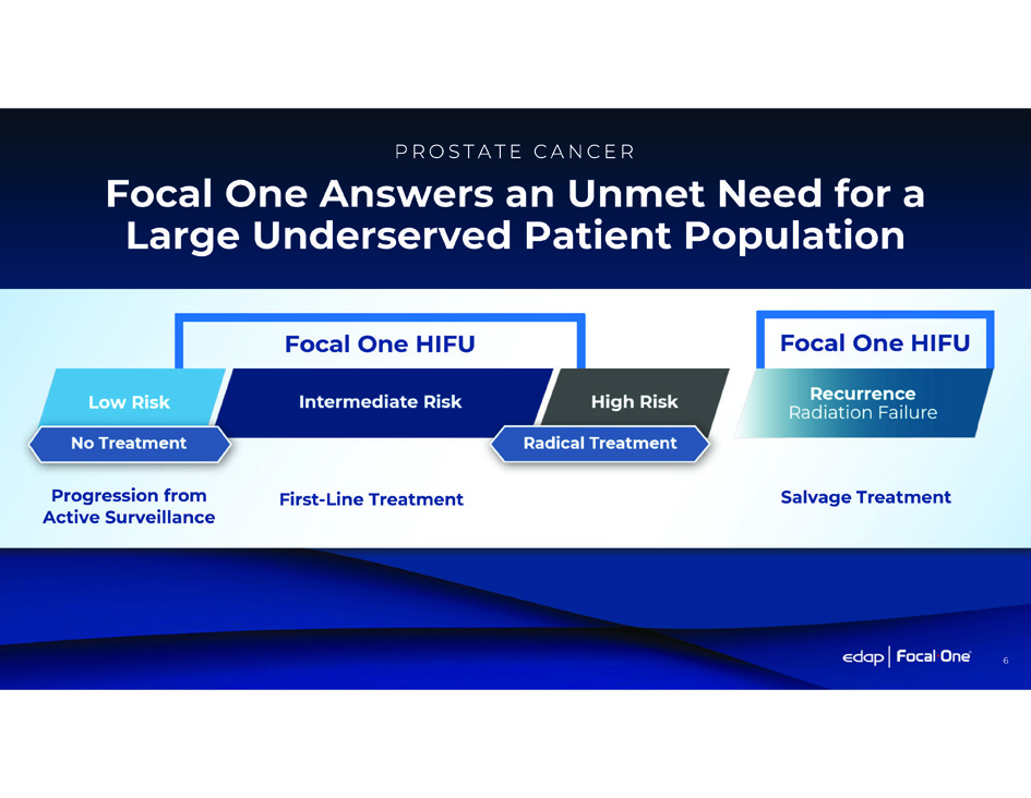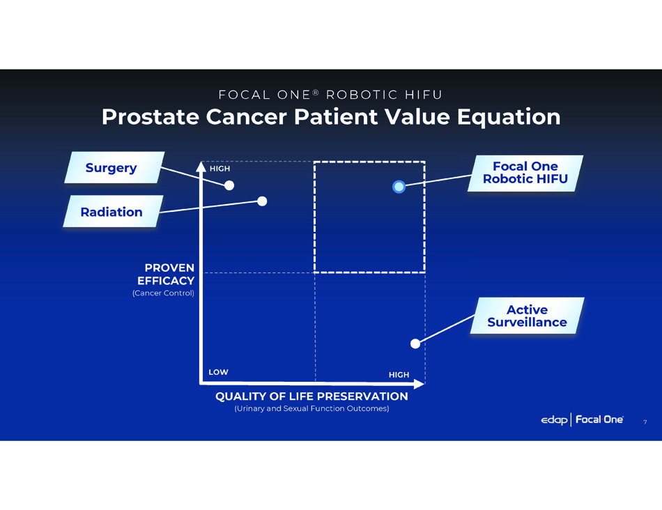 Focal One Answers an Unmet Need for a Large Underserved Patient Population PR O S T A T E C A N C ER Focal One HIFU Focal One HIFU 6 First - Line Treatment Progression from Active Surveillance Salvage Treatment
