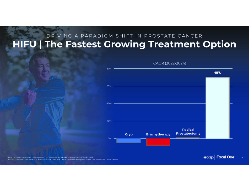 9 0% 20% 40% 60% 80% CAGR (2022 - 2024) DR I V I N G A P A R A DI G M S H I F T I N P R O S T A T E C A N C E R HIFU | The Fastest Growing Treatment Option Based on Medicare claims data reported by CMS in the HOPPS Final Rules for FY2024 – FY2026.. As CMS publishes claims data on a retrospective basis, the CAGR shown reflects growth over the 2022 – 2024 claims period. HIFU Cryo Brachytherapy Radical Prostatectomy