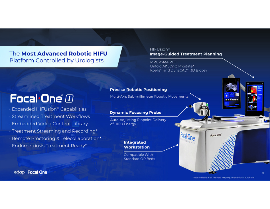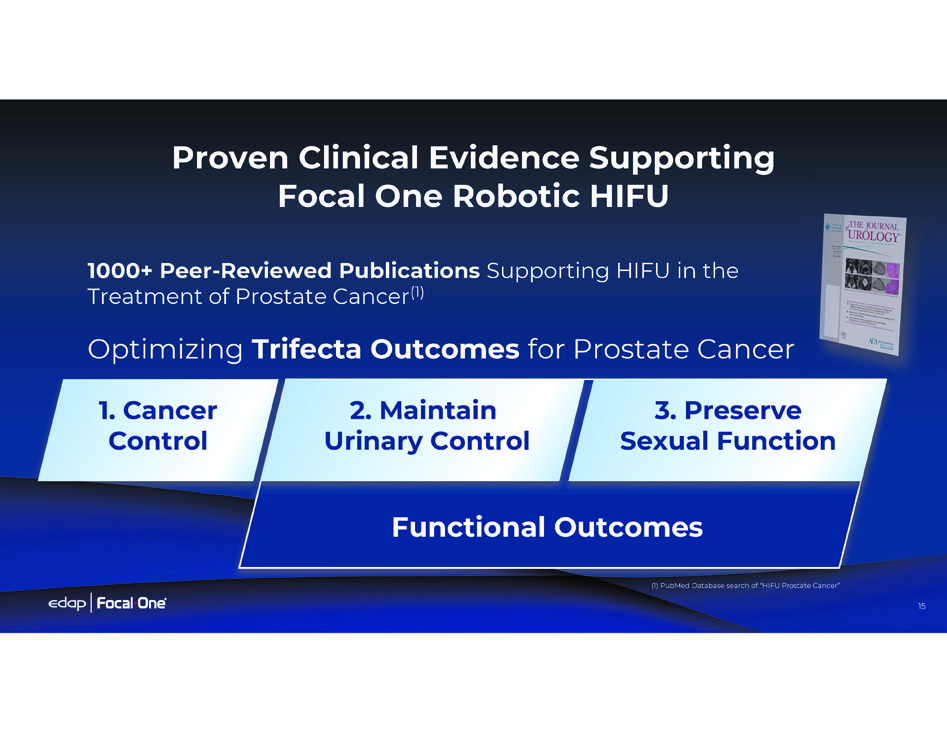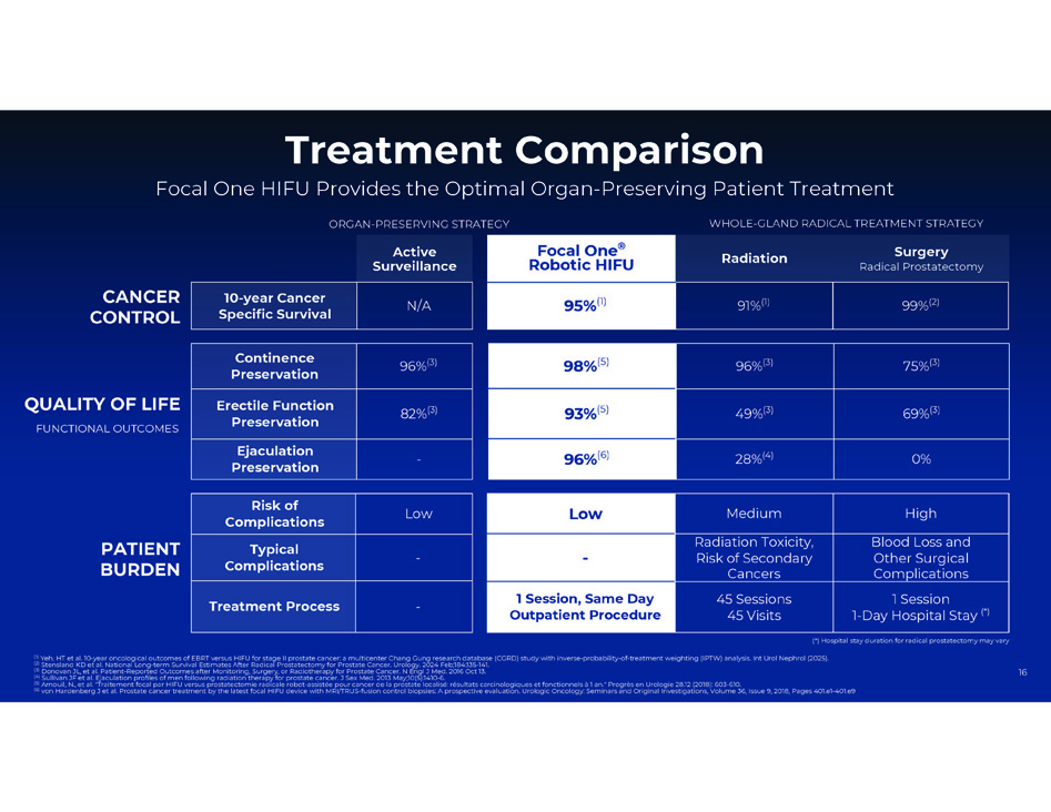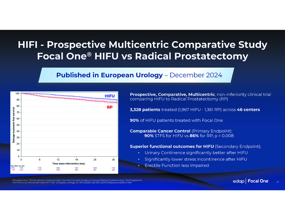 16 CANCER CONTROL PATIENT BURDEN Treatment Comparison Focal One HIFU Provides the Optimal Organ - Preserving Patient Treatment ORGAN - PRESERVING STRATEGY WHOLE - GLAND RADICAL TREATMENT STRATEGY QUALITY OF LIFE FUNCTIONAL OUTCOMES 96% (3) Continence Preservation 82% (3) Erectile Function Preservation - Ejaculation Preservation Low Risk of Complications - Typical Complications - Treatment Process Active Surveillance N/A 10 - year Cancer Specific Survival (*) Hospital stay duration for radical prostatectomy may vary (1) Yeh, HT et al. 10 - year oncological outcomes of EBRT versus HIFU for stage II prostate cancer: a multicenter Chang Gung research database (CGRD) study with inverse - probability - of - treatment weighting (IPTW) analysis. Int Urol Nephrol (2025). (2) Stensland KD et al. National Long - term Survival Estimates After Radical Prostatectomy for Prostate Cancer. Urology. 2024 Feb;184:135 - 141. (3) Donovan JL, et al. Patient - Reported Outcomes after Monitoring, Surgery, or Radiotherapy for Prostate Cancer. N Engl J Med. 2016 Oct 13. (4) Sullivan JF et al. Ejaculation profiles of men following radiation therapy for prostate cancer. J Sex Med. 2013 May;10(5):1410 - 6. (5) Arnouil, N., et al. "Traitement focal par HIFU versus prostatectomie radicale robot - assistée pour cancer de la prostate localisé: résultats carcinologiques et fonctionnels à 1 an." Progrès en Urologie 28.12 (2018): 603 - 610. (6) von Hardenberg J et al. Prostate cancer treatment by the latest focal HIFU device with MRI/TRUS - fusion control biopsies: A prospective evaluation. Urologic Oncology: Seminars and Original Investigations, Volume 36, Issue 9, 2018, Pages 401.e1 - 401.e9 75% (3) 96% (3) 98% (5) 69% (3) 49% (3) 93% (5) 0% 28% (4) 96% (6) High Medium Low Blood Loss and Other Surgical Complications Radiation Toxicity, Risk of Secondary Cancers - 1 Session 1 - Day Hospital Stay (*) 45 Sessions 45 Visits 1 Session, Same Day Outpatient Procedure Radiation Surgery Radical Prostatectomy Focal One ® Robotic HIFU 99% (2) 91% (1) 95% (1)