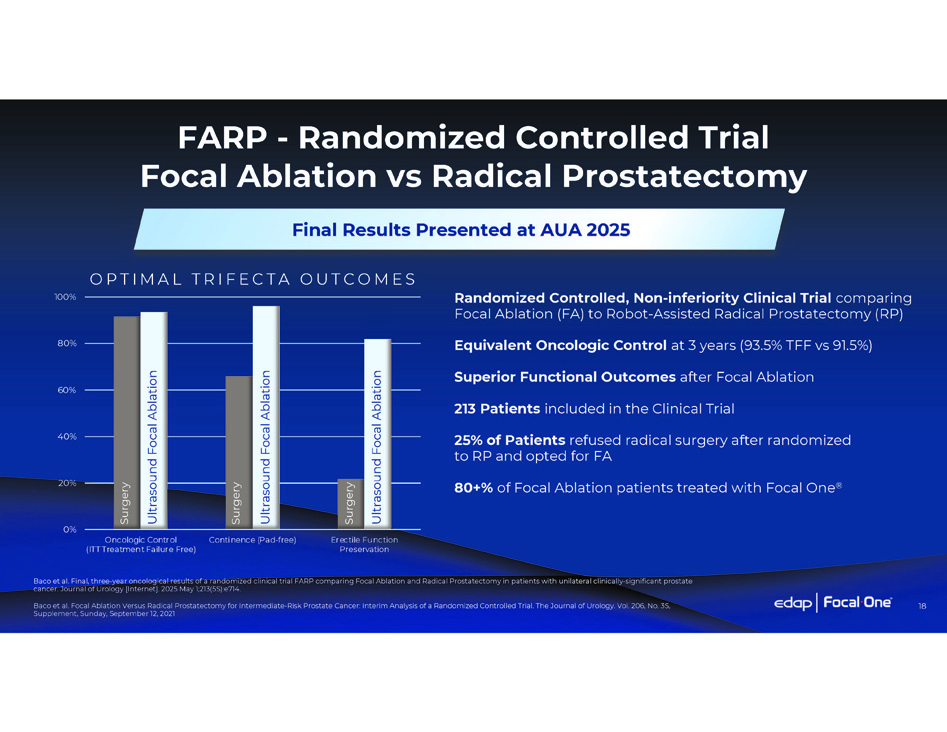 17 HIFI - Prospective Multicentric Comparative Study Focal One ® HIFU vs Radical Prostatectomy Prospective, Comparative, Multicentric , non - inferiority clinical trial comparing HIFU to Radical Prostatectomy (RP) 3,328 patients treated (1,967 HIFU - 1,361 RP) across 46 centers 90% of HIFU patients treated with Focal One Comparable Cancer Control (Primary Endpoint): 90% STFS for HIFU vs 86% for RP; p = 0.008 Superior functional outcomes for HIFU (Secondary Endpoint): • Urinary Continence significantly better after HIFU • Significantly lower stress incontinence after HIFU • Erectile Function less impaired Published in European Urology – December 2024 Ploussard et al. “Whole - gland or Subtotal High - intensity Focused Ultrasound Versus Radical Prostatectomy: The Prospective, Noninferiority, Nonrandomized HIFI Trial.” European urology vol. 87,5 (2025): 526 - 533. doi:10.1016/j.eururo.2024.11.006