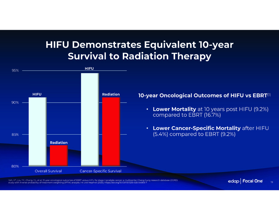 19 HIFU Demonstrates Equivalent 10 - year Survival to Radiation Therapy 10 - year Oncological Outcomes of HIFU vs EBRT (1) • Lower Mortality at 10 years post HIFU (9.2%) compared to EBRT (16.7%) • Lower Cancer - Specific Mortality after HIFU (5.4%) compared to EBRT (9.2%) Radiation HIFU HIFU Radiation 80% 85% 90% 95% Overall Survival Cancer - Specific Survival Yeh, HT., Liu, YY., Chang, Y.L. et al. 10 - year oncological outcomes of EBRT versus HIFU for stage II prostate cancer: a multicenter Chang Gung research database (CGRD) study with inverse - probability - of - treatment weighting (IPTW) analysis. Int Urol Nephrol (2025). https://doi.org/10.1007/s11255 - 025 - 04805 - 7