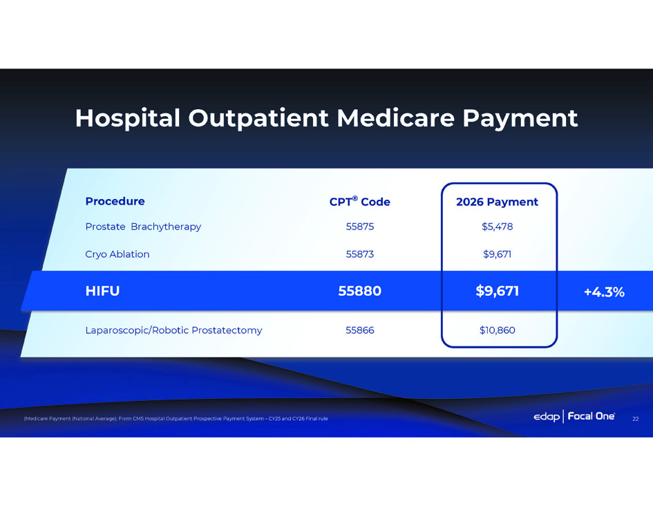 Environment for Growth ST R O N G R E I MBU R SE ME N T Creates Favorable 1. APC Level 6 Under CMS for CY23, CY24 and CY25 2. 90% Increase in Reimbursement in 2023 3. APC Level 6 Maintained by CMS in 2026 Based on CMS Hospital Outpatient Prospective Payment System Final rule 21