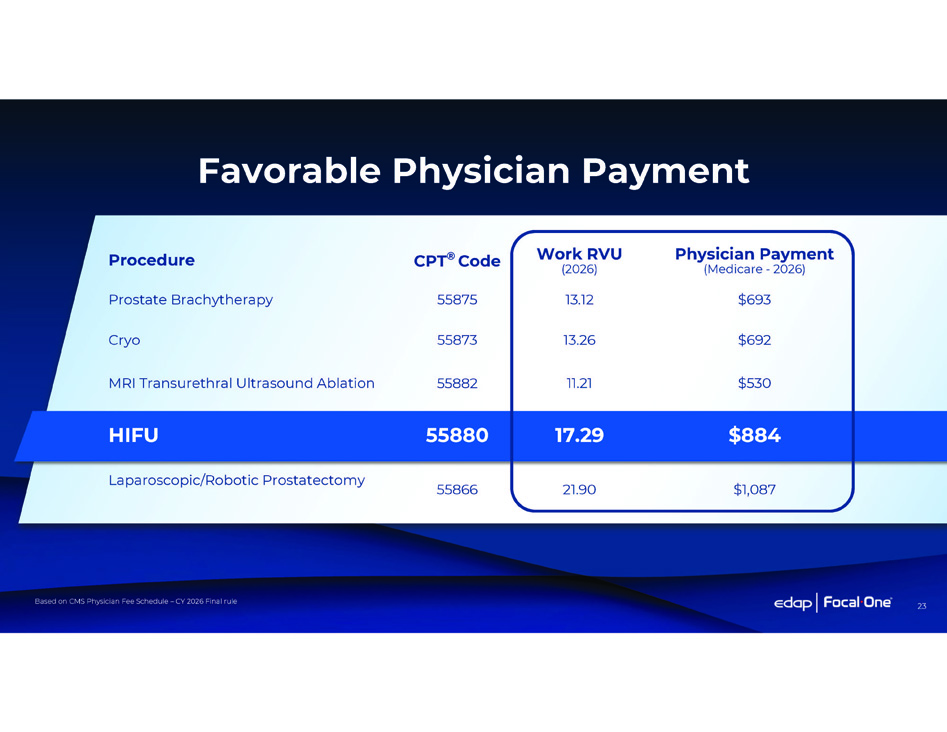 Favorable Physician Payment Physician Payment (Medicare - 2026) Work RVU (2026) CPT ® Code Procedure $693 13.12 55875 Prostate Brachytherapy $692 13.26 55873 Cryo $530 11.21 55882 MRI Transurethral Ultrasound Ablation $884 17.29 55880 HIFU Laparoscopic/Robotic Prostatectomy 55866 21.90 $1,087 Based on CMS Physician Fee Schedule – CY 2026 Final rule 23